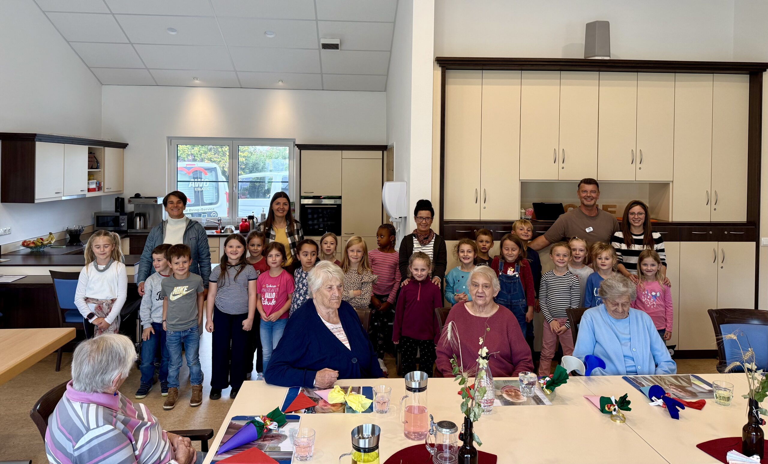 Anschließend wurde gemeinsam mit dem AWO-Personal sowie den Seniorinnen und Senioren ein kleines Bewegungsspiel gespielt: „Riese, Zwerg“. Auch ein zweites Lied ließen die Kinder erklingen, bevor die Begegnung einen besonders süßen Abschluss fand: Die Tagesgäste überreichten den Erstklässlern liebevoll gebastelte Schultüten, prall gefüllt mit allerlei Süßigkeiten – richtige „Zuckertüten“, über die sich die Kinder riesig freuten!