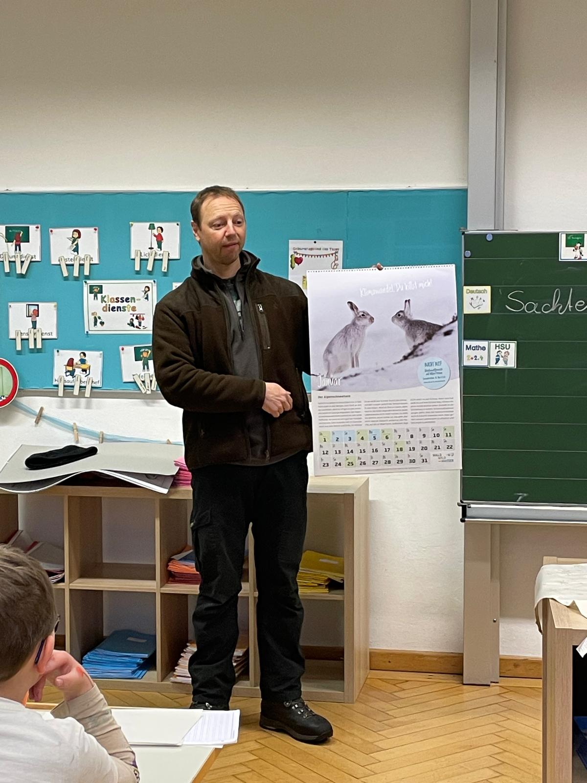 Kürzlich bekamen die Klassen 3 und 4 besonderen Besuch: Herr Forster, Förster und Jäger, war bei uns zu Gast. Er brachte den Tierkalender des Bayerischen Jagdverbands (BJV) mit und erzählte den Kindern viel Interessantes über unsere heimischen Tiere und den Wald.