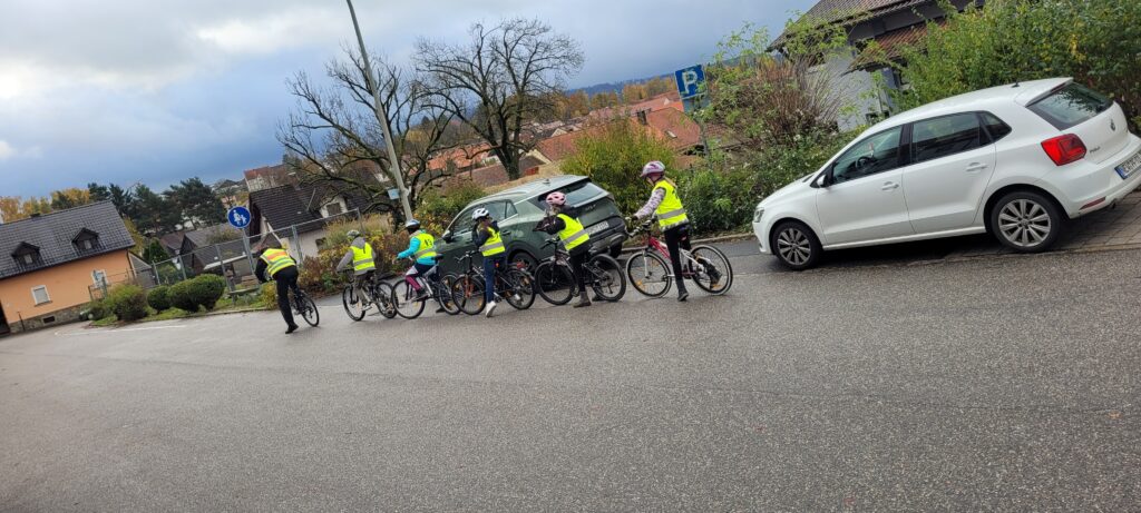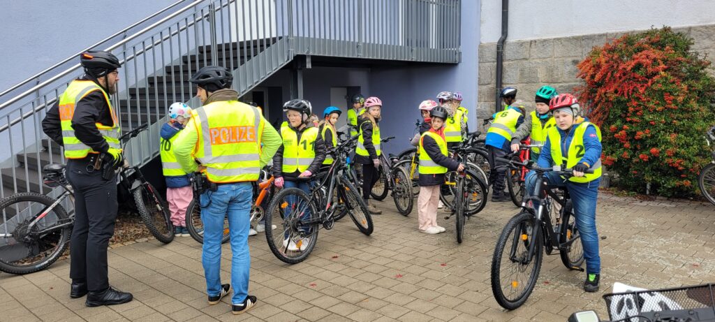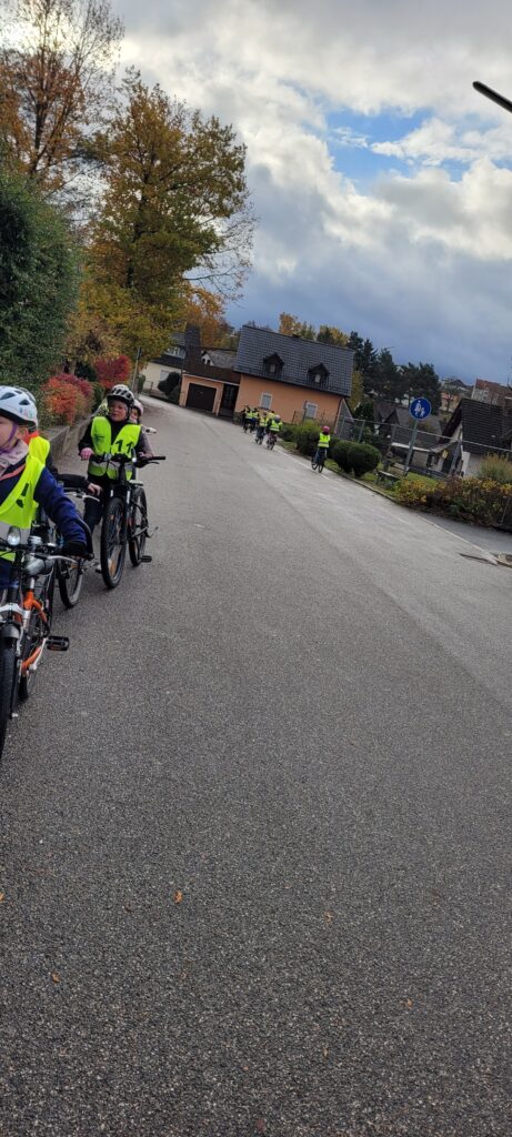 Eine Woche nach der bestandenen praktischen Fahrradprüfung durften am Dienstag, den 25.10.2025, alle Viertklässler ihr gelerntes Wissen über die Regeln des Straßenverkehrs noch in der Verkehrswirklichkeit in Eslarn unter Beweis stellen. Freudig wurden die Polizisten Wolfgang und Berni von den Kindern begrüßt. Nachdem die Begleiteltern eingewiesen wurden von der Polizei, machten sie sich sofort auf, sich als Streckenposten an die Gefahrenstellen in Eslarn zu stellen.