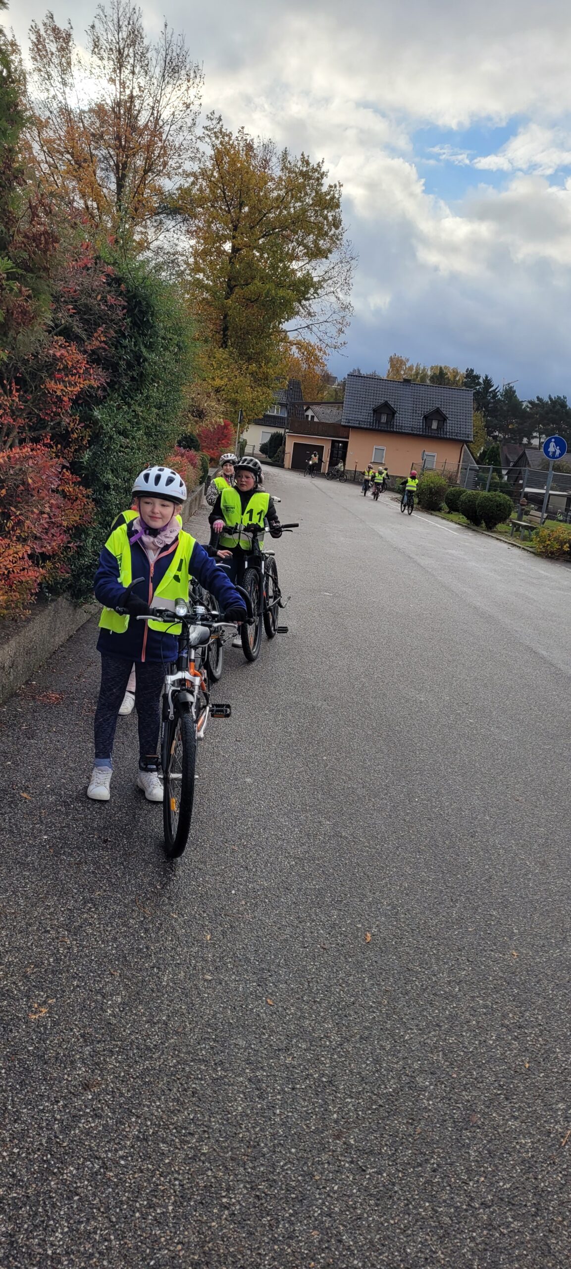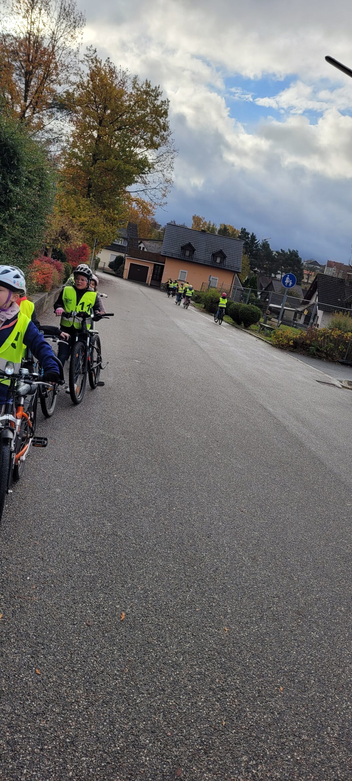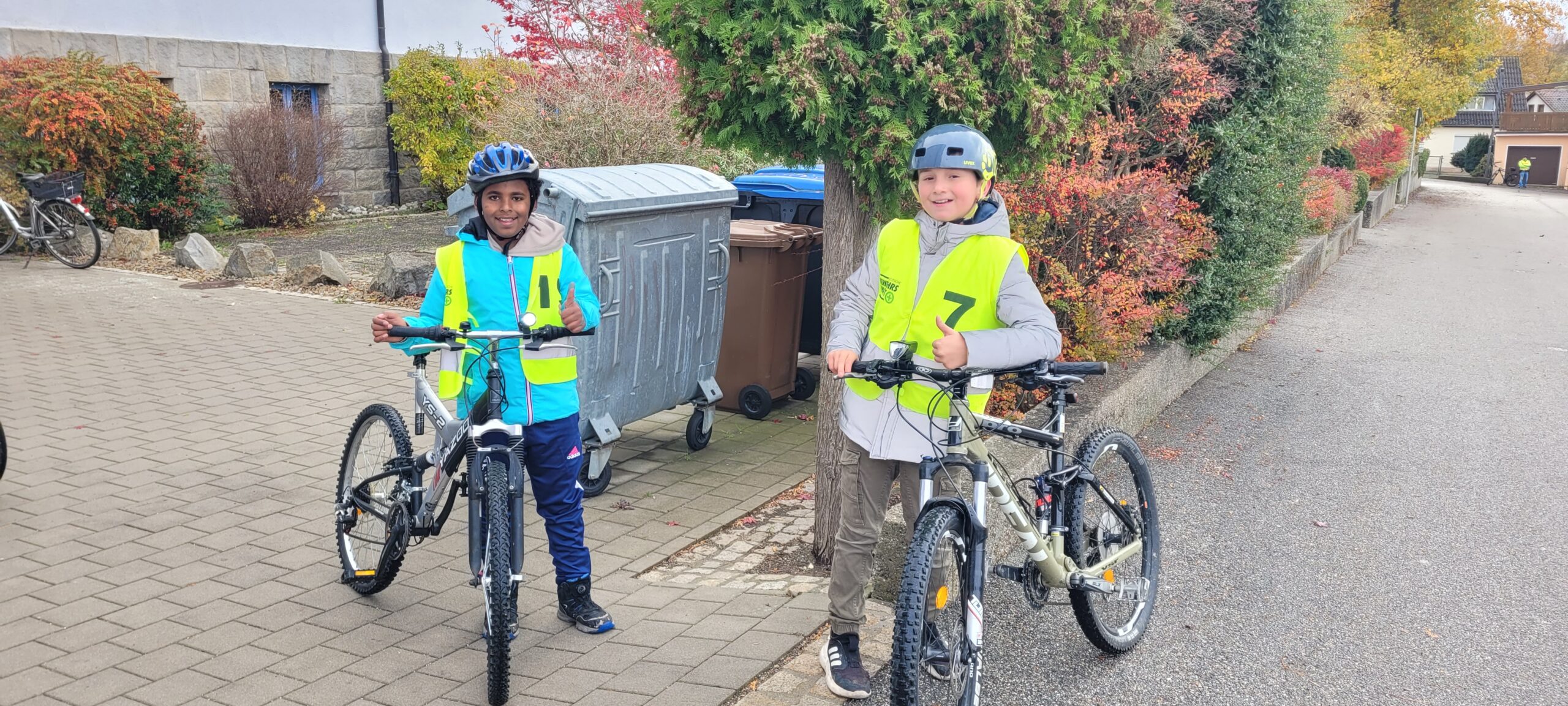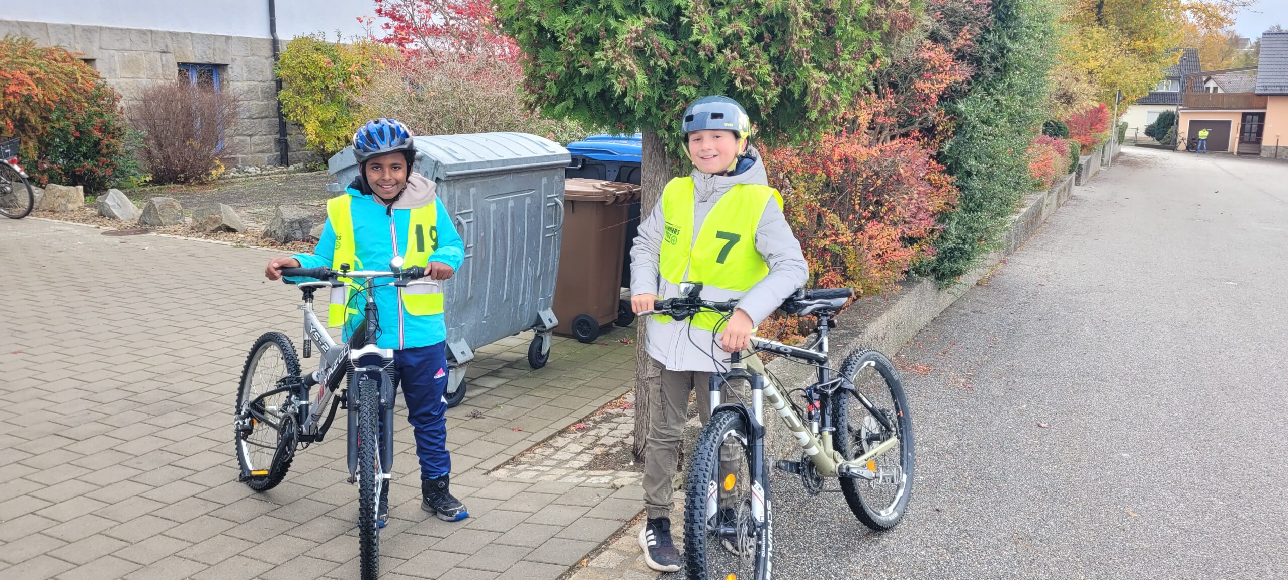 Eine Woche nach der bestandenen praktischen Fahrradprüfung durften am Dienstag, den 25.10.2025, alle Viertklässler ihr gelerntes Wissen über die Regeln des Straßenverkehrs noch in der Verkehrswirklichkeit in Eslarn unter Beweis stellen. Freudig wurden die Polizisten Wolfgang und Berni von den Kindern begrüßt. Nachdem die Begleiteltern eingewiesen wurden von der Polizei, machten sie sich sofort auf, sich als Streckenposten an die Gefahrenstellen in Eslarn zu stellen.