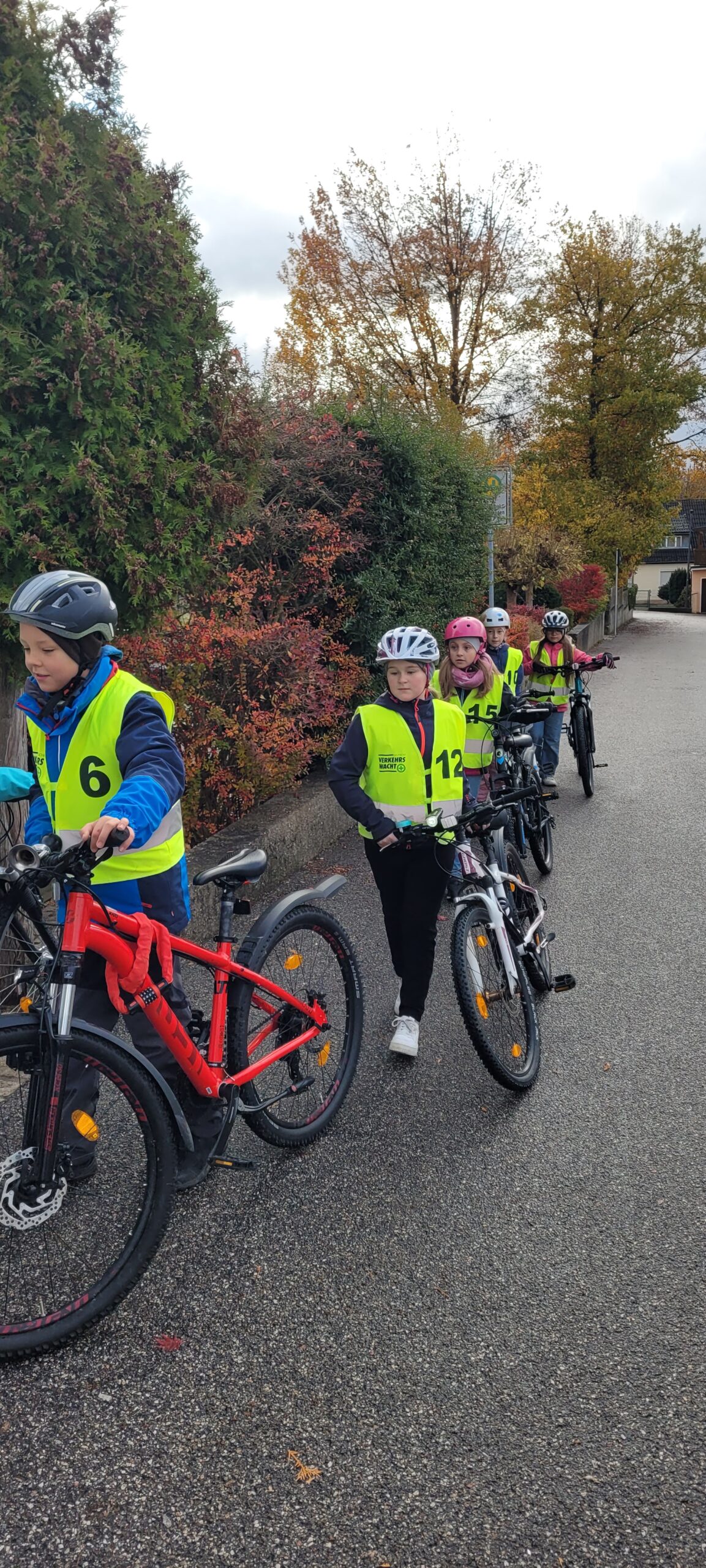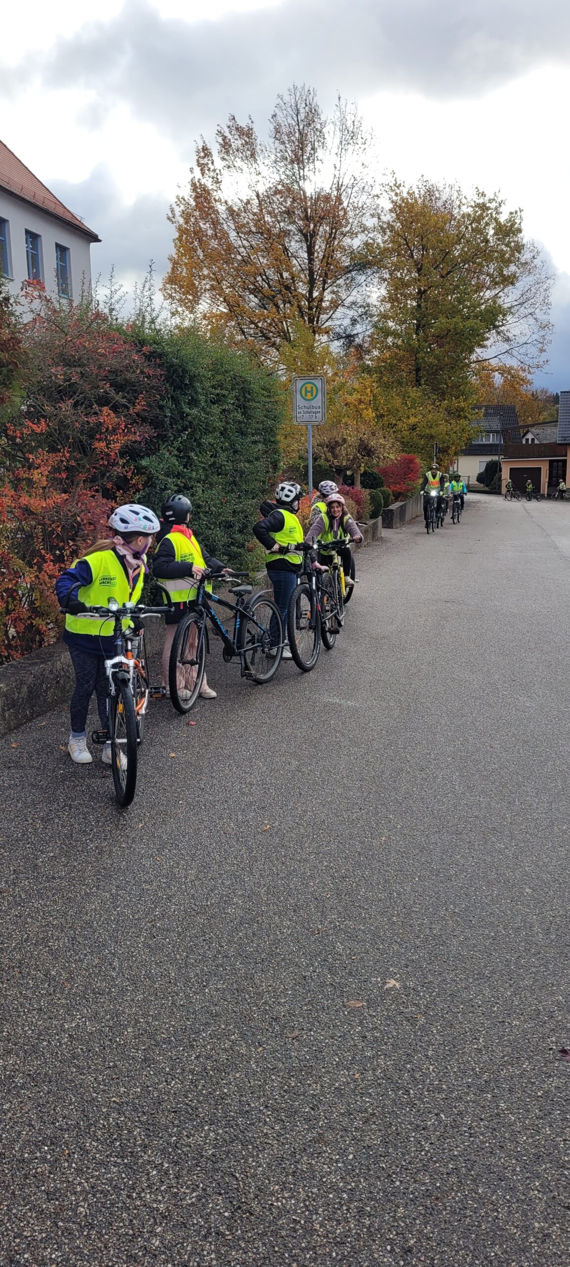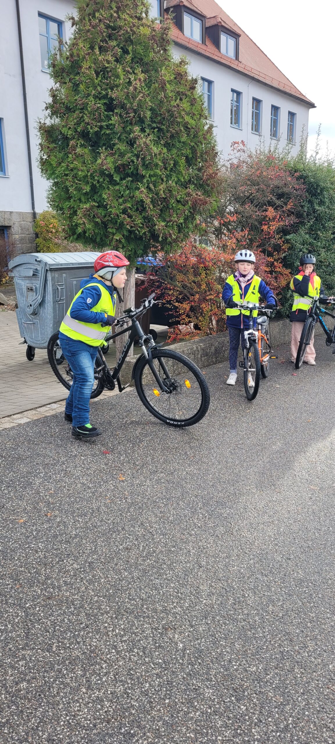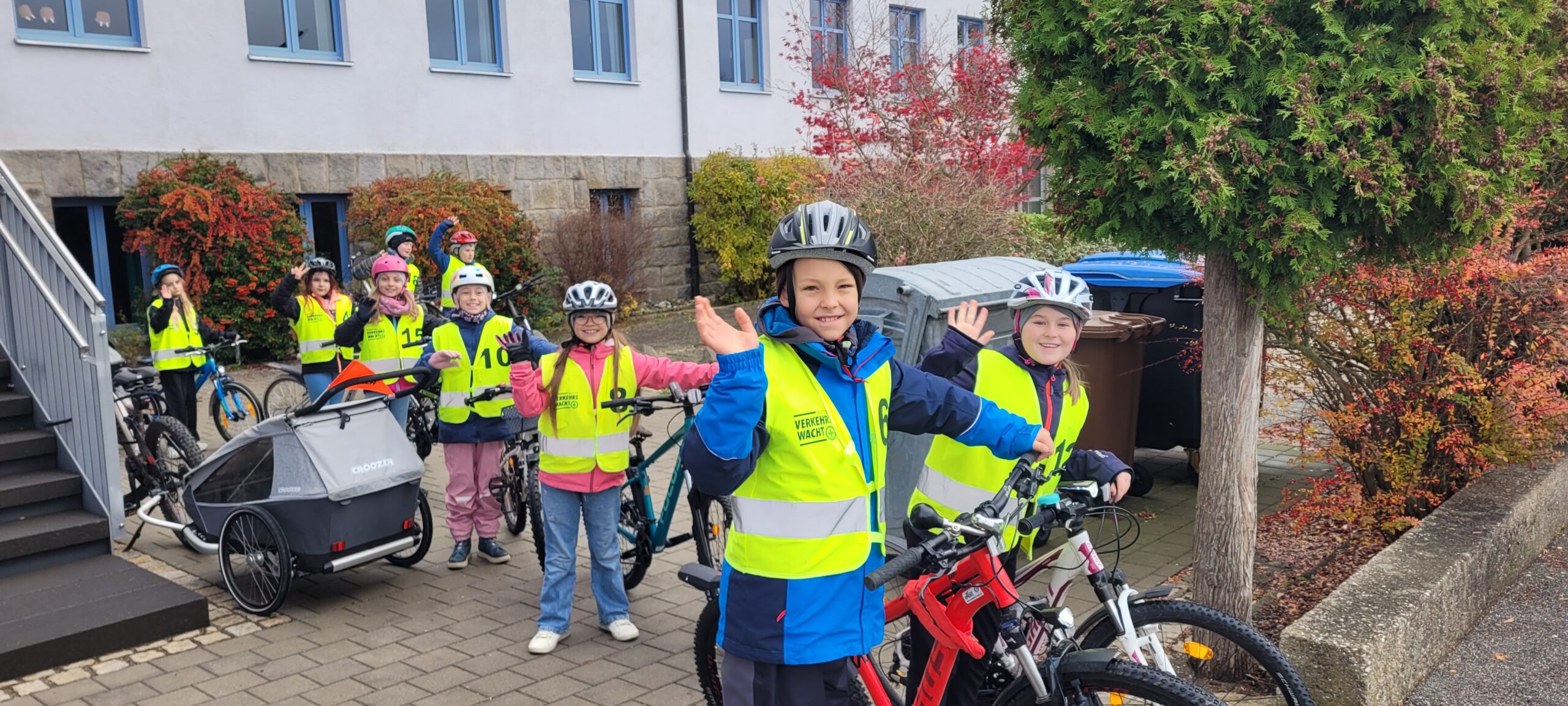Eine Woche nach der bestandenen praktischen Fahrradprüfung durften am Dienstag, den 25.10.2025, alle Viertklässler ihr gelerntes Wissen über die Regeln des Straßenverkehrs noch in der Verkehrswirklichkeit in Eslarn unter Beweis stellen. Freudig wurden die Polizisten Wolfgang und Berni von den Kindern begrüßt. Nachdem die Begleiteltern eingewiesen wurden von der Polizei, machten sie sich sofort auf, sich als Streckenposten an die Gefahrenstellen in Eslarn zu stellen.