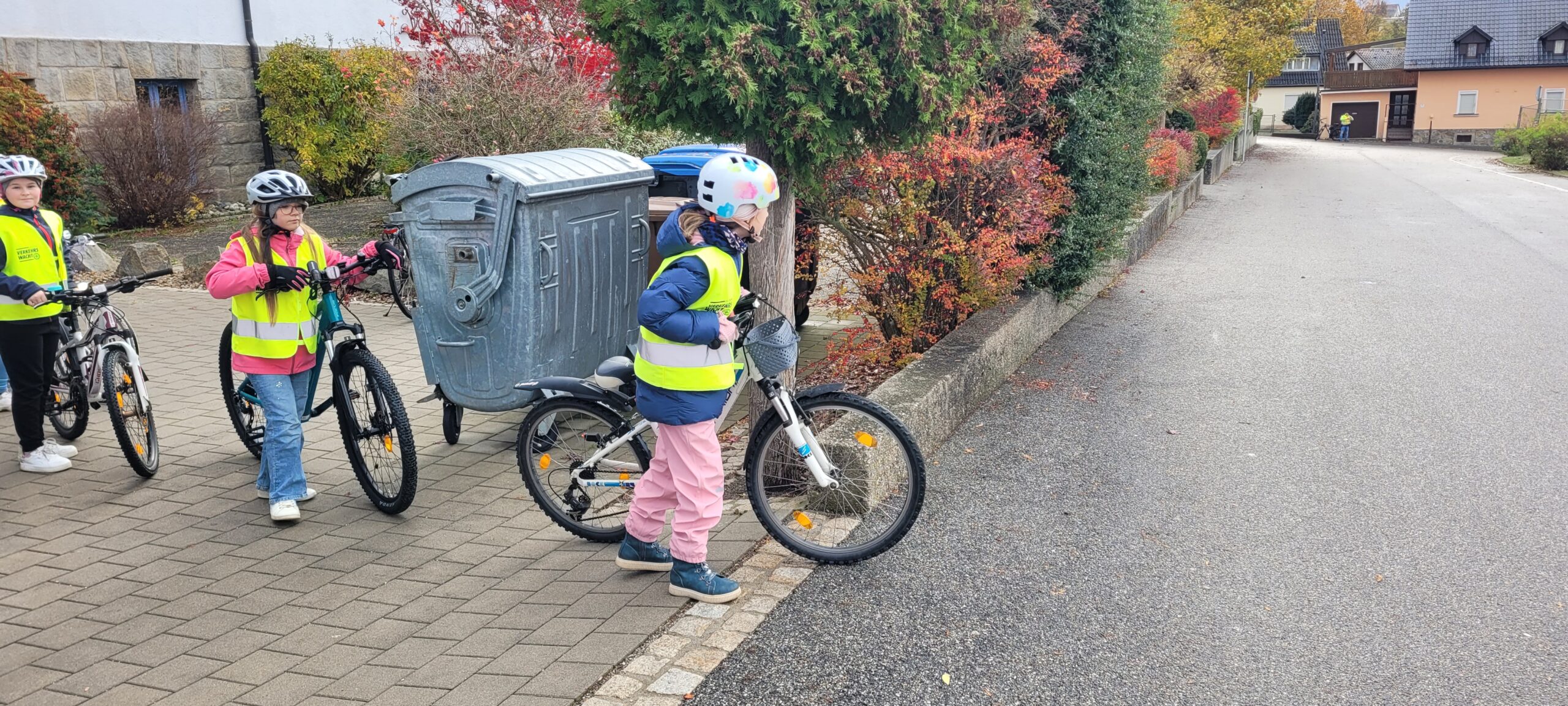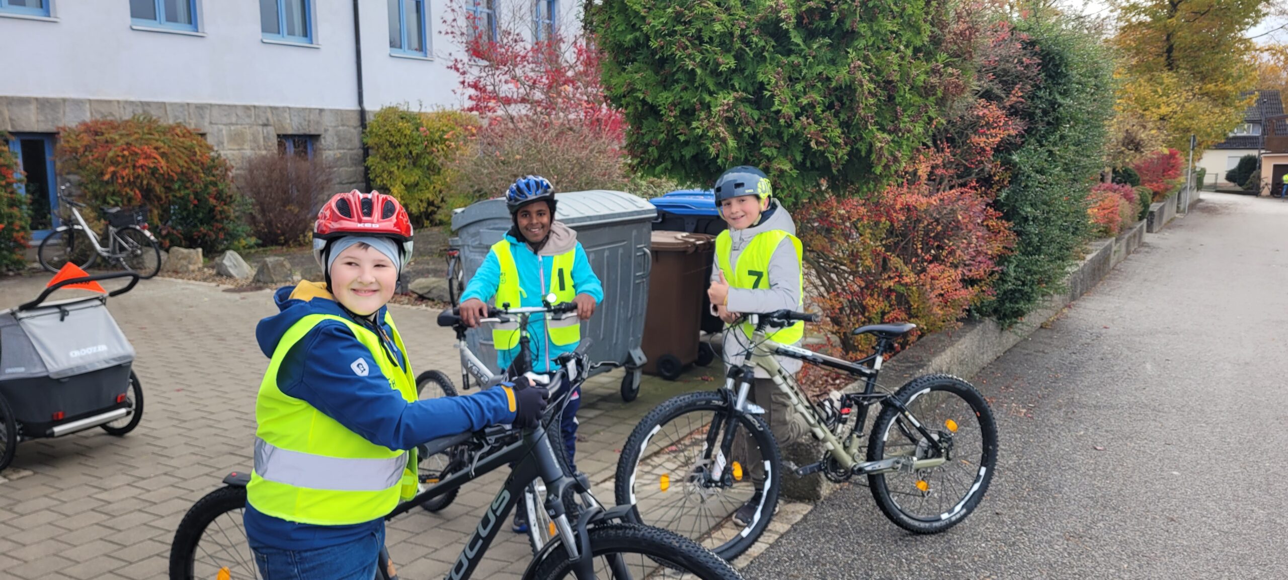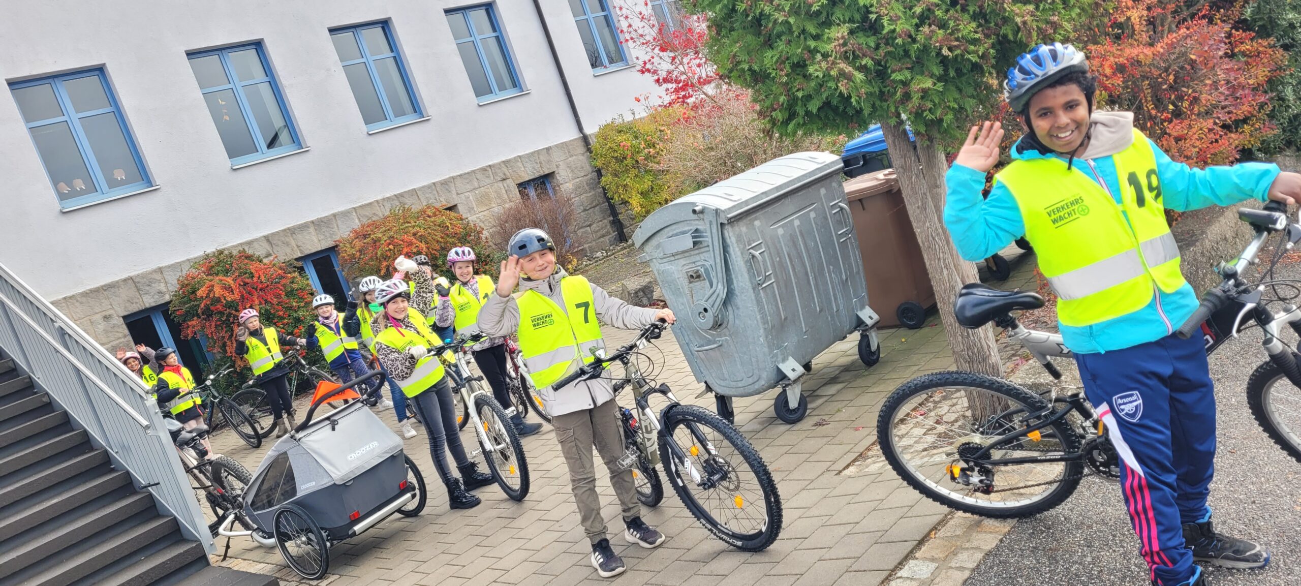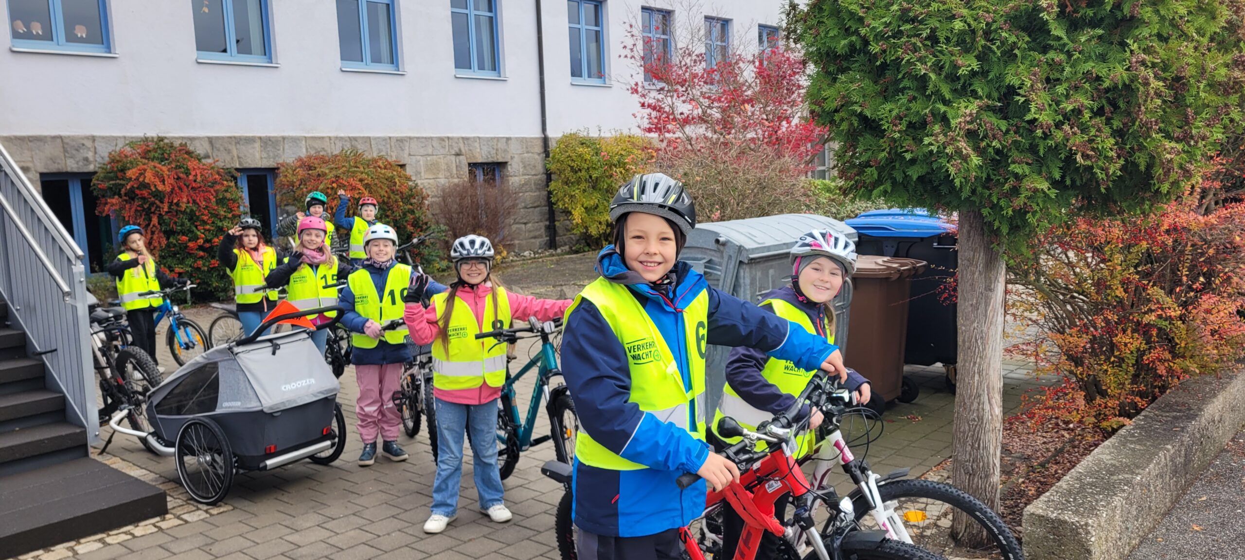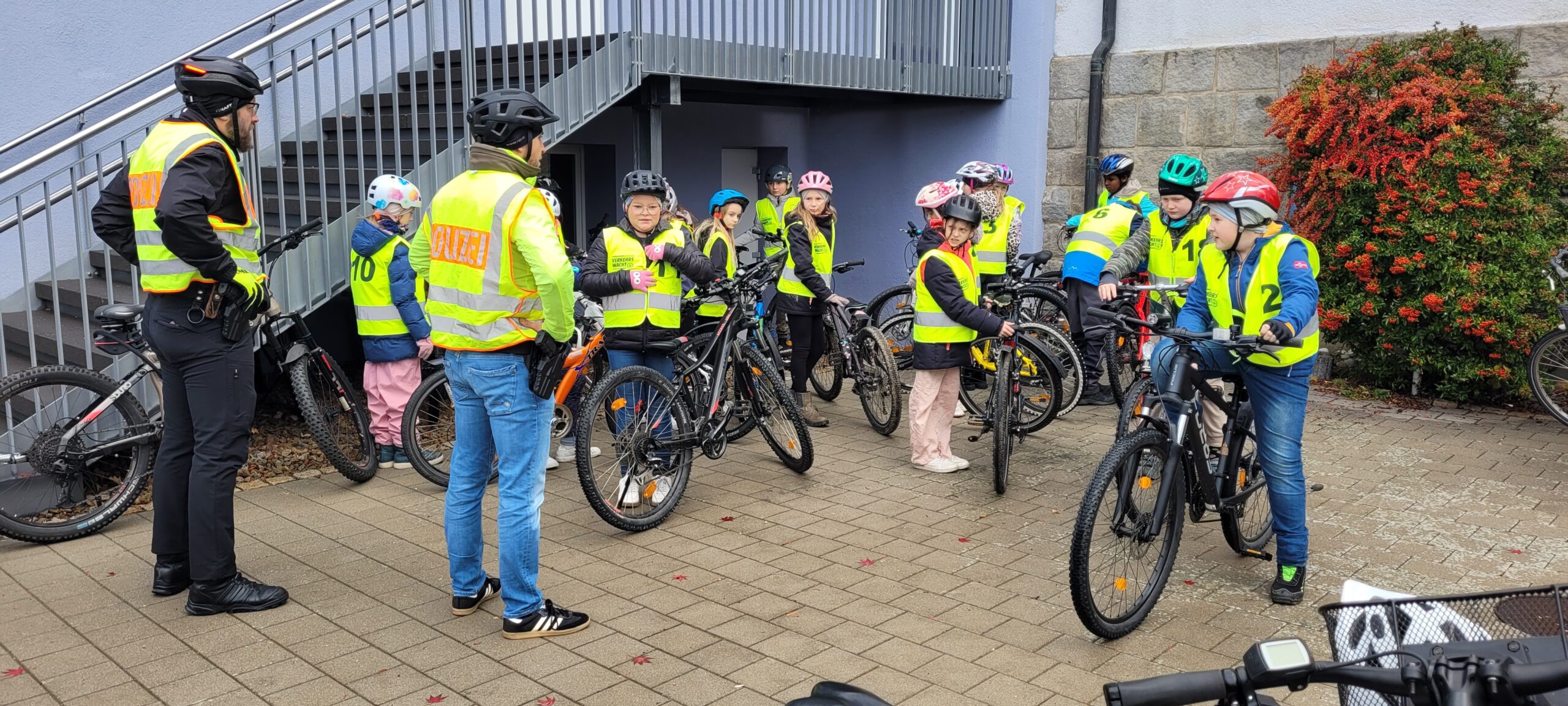Eine Woche nach der bestandenen praktischen Fahrradprüfung durften am Dienstag, den 25.10.2025, alle Viertklässler ihr gelerntes Wissen über die Regeln des Straßenverkehrs noch in der Verkehrswirklichkeit in Eslarn unter Beweis stellen. Freudig wurden die Polizisten Wolfgang und Berni von den Kindern begrüßt. Nachdem die Begleiteltern eingewiesen wurden von der Polizei, machten sie sich sofort auf, sich als Streckenposten an die Gefahrenstellen in Eslarn zu stellen.