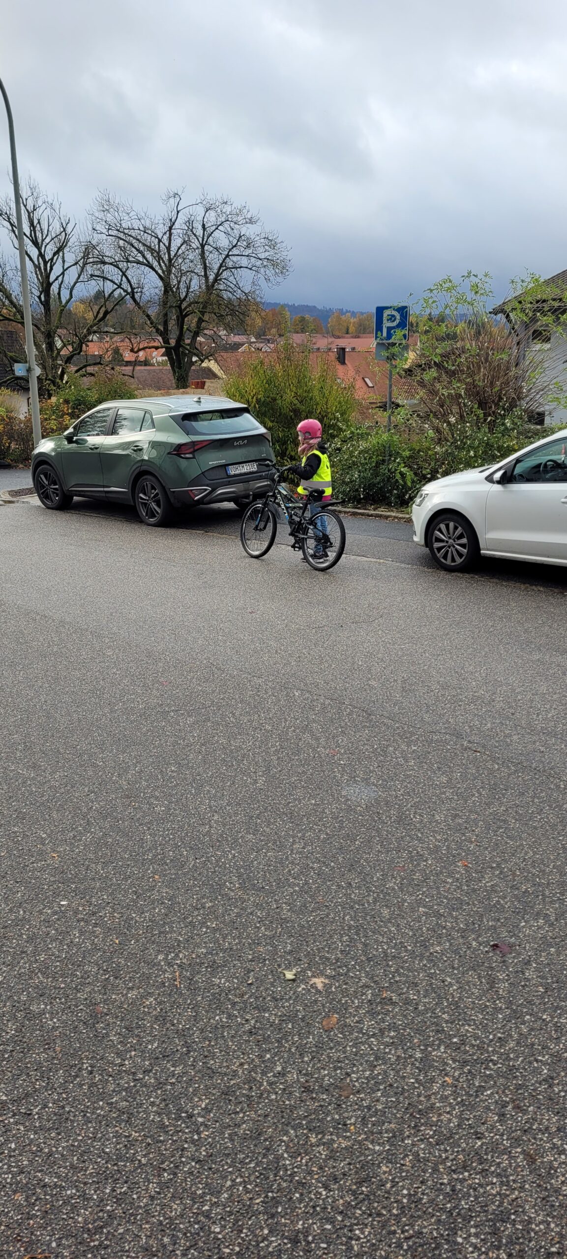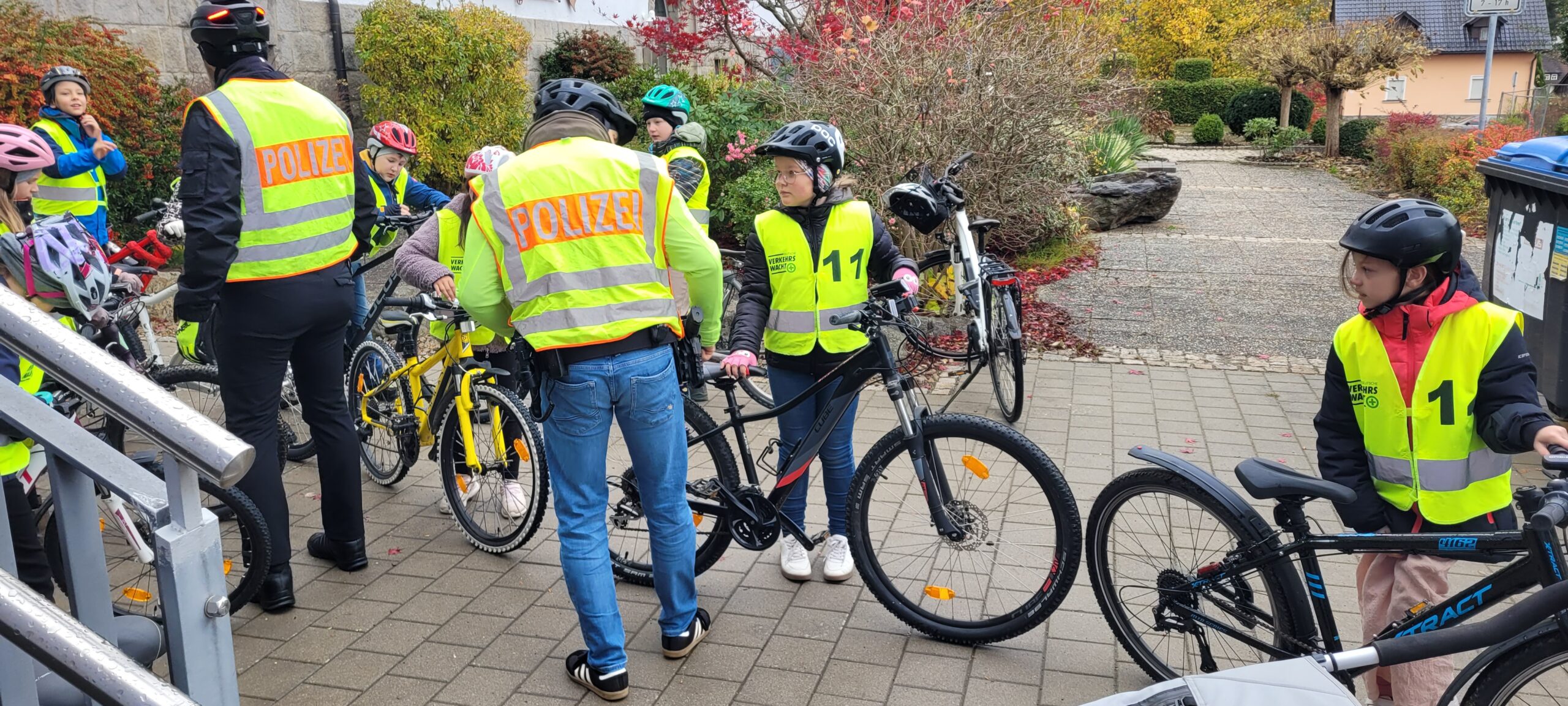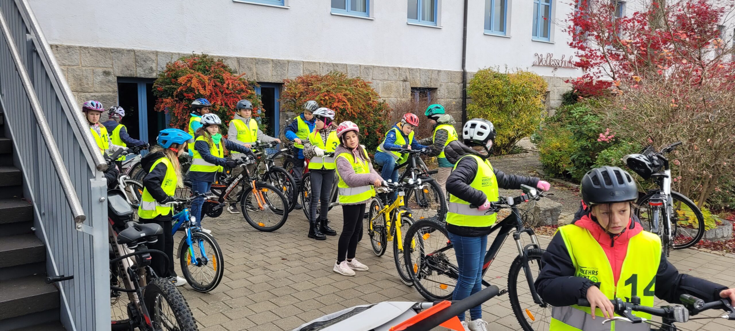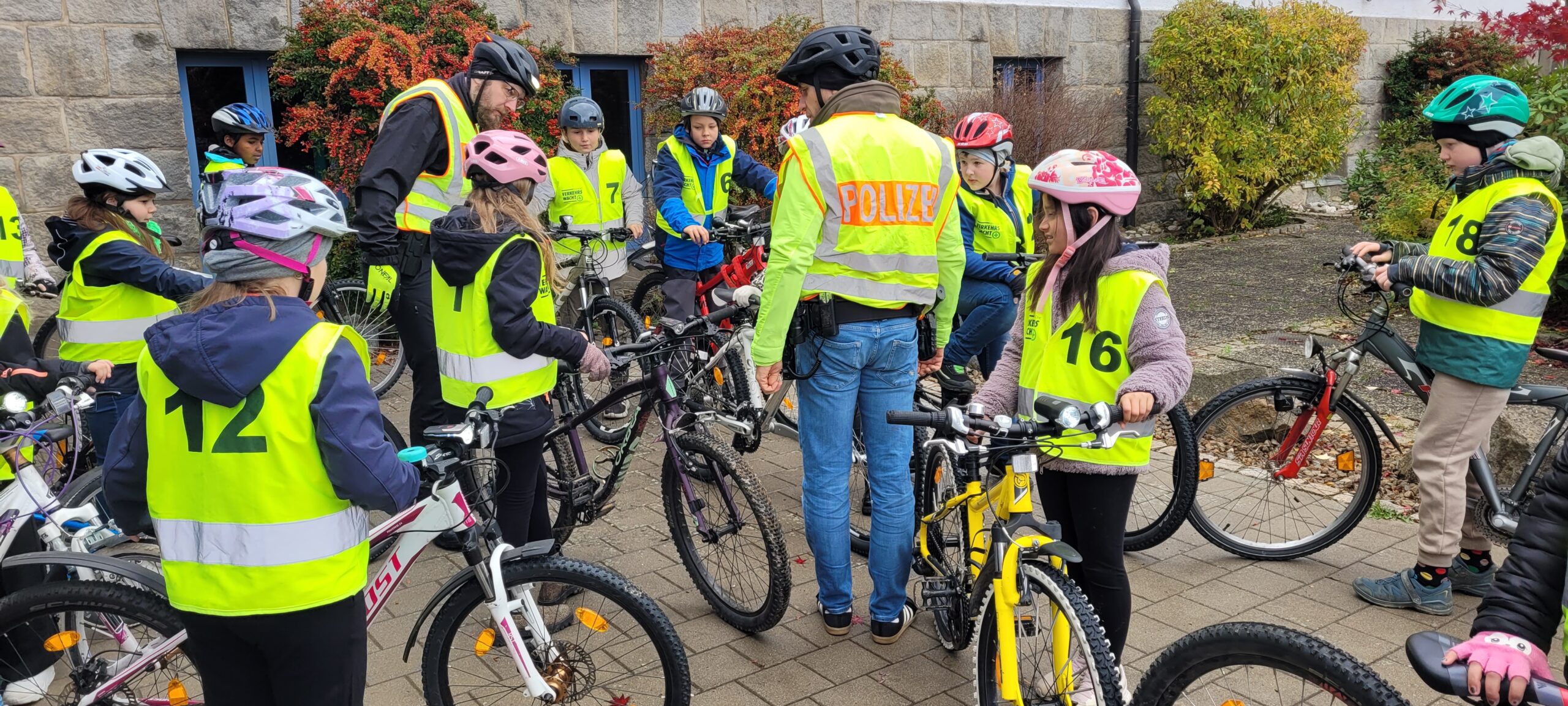 Eine Woche nach der bestandenen praktischen Fahrradprüfung durften am Dienstag, den 25.10.2025, alle Viertklässler ihr gelerntes Wissen über die Regeln des Straßenverkehrs noch in der Verkehrswirklichkeit in Eslarn unter Beweis stellen. Freudig wurden die Polizisten Wolfgang und Berni von den Kindern begrüßt. Nachdem die Begleiteltern eingewiesen wurden von der Polizei, machten sie sich sofort auf, sich als Streckenposten an die Gefahrenstellen in Eslarn zu stellen.