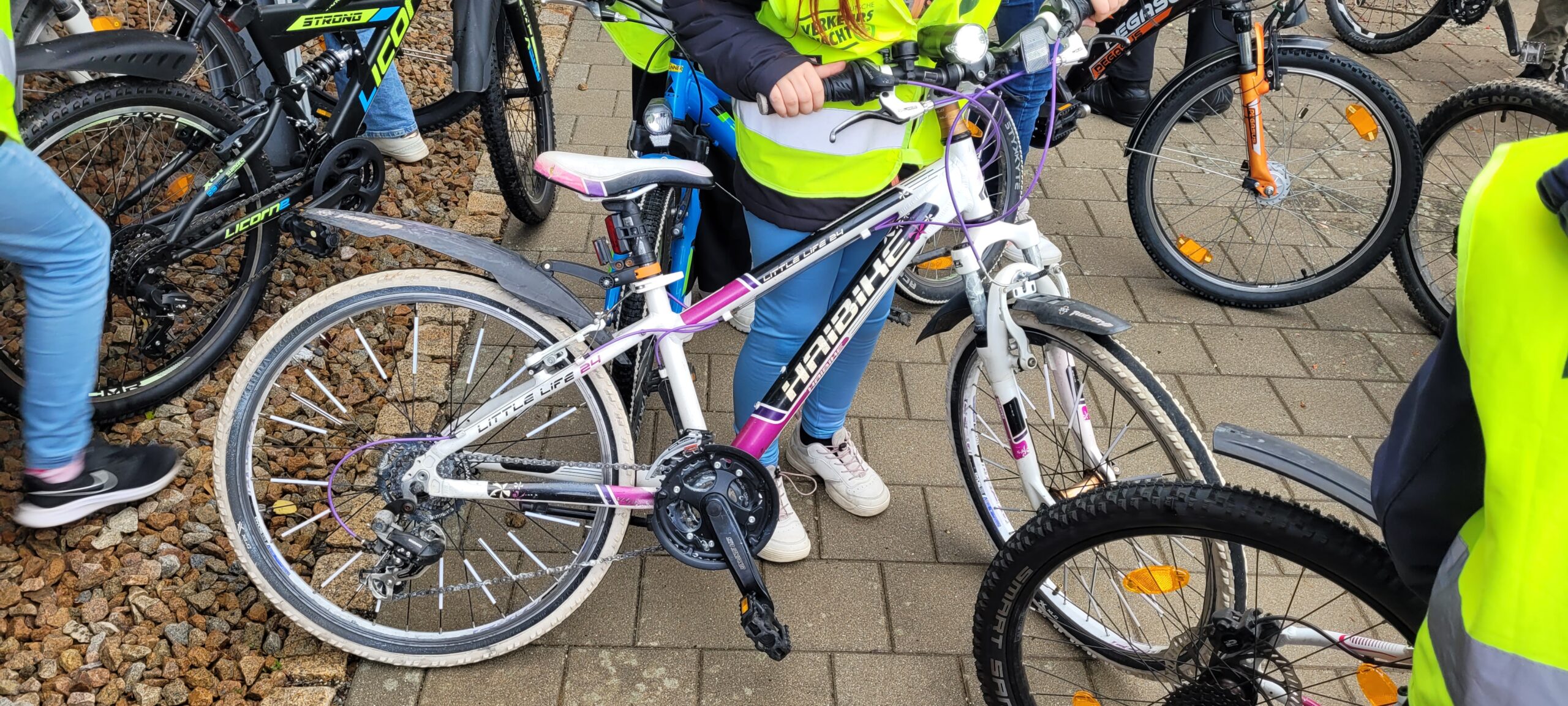 Die Kinder stellen sich nacheinander mit ihren eigens mitgebrachten Fahrrädern auf. Zum Glück! Alle Fahrräder waren verkehrssicher. Danke an alle Eltern, die zu Hause mit ihren Kindern, die Fahrräder genau untersucht haben und noch die notwendige Ausstattung für ein verkehrssicheres Fahrrad zusammen mit den Kindern angebracht und besorgt hatten.