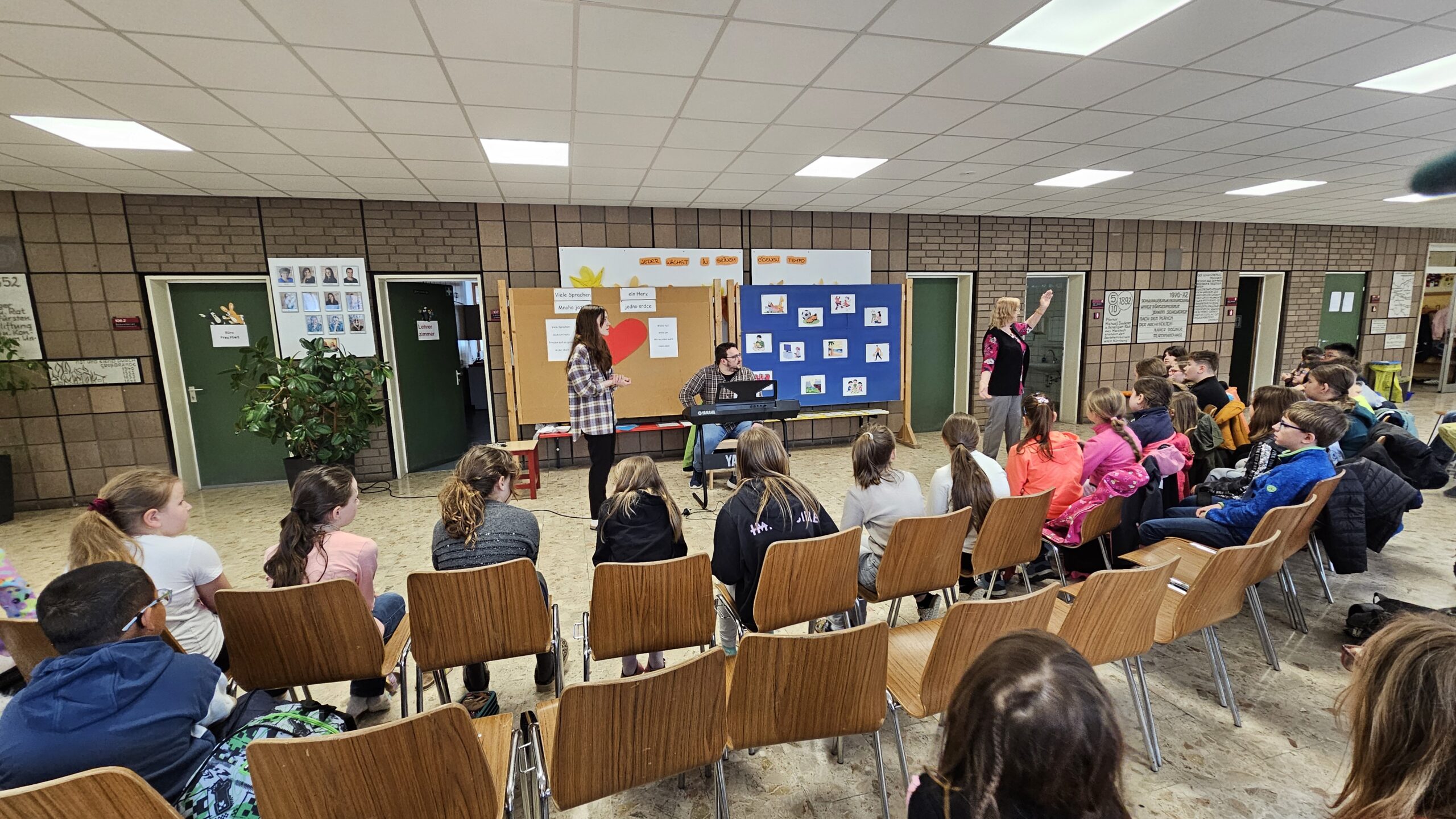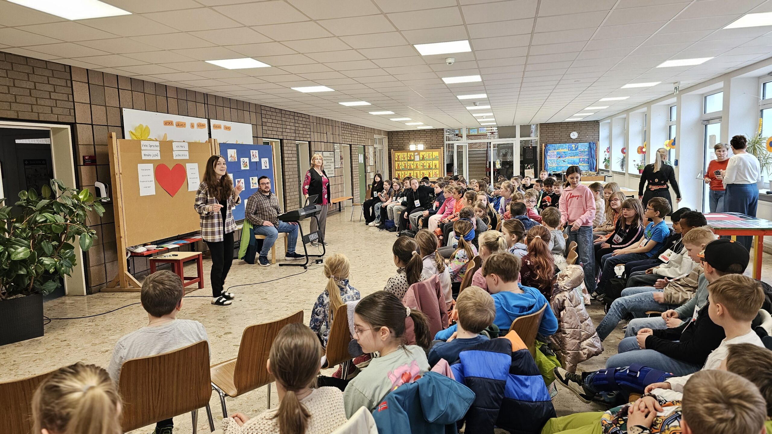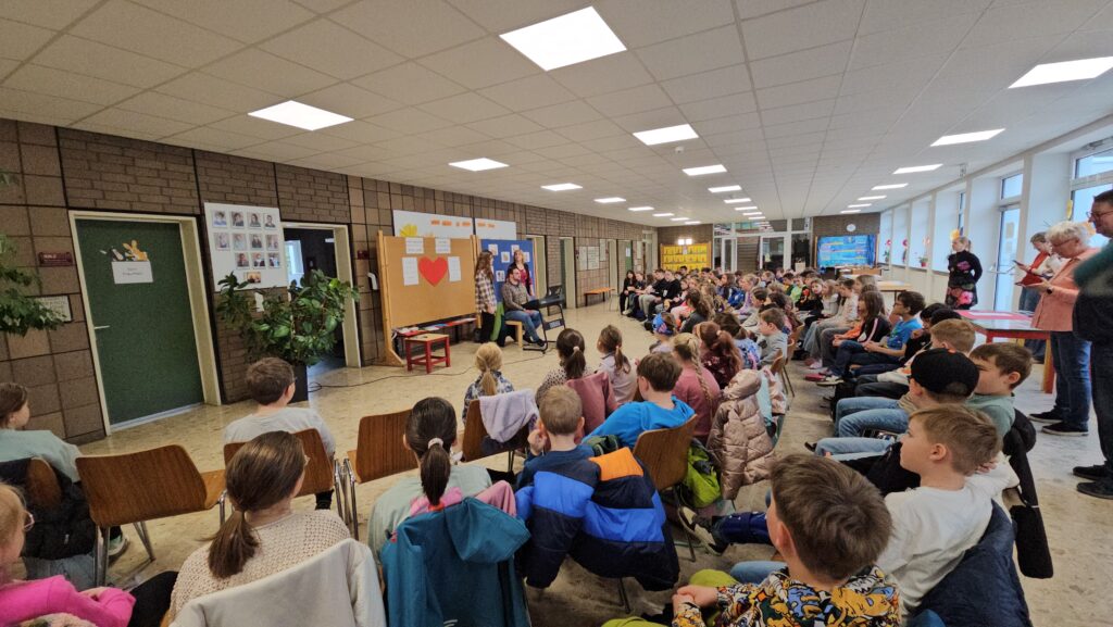 Außerdem gestalteten die Kinder Plakate, die im Gottesdienst präsentiert werden sollen. Ein weiterer Schwerpunkt lag auf der Vorbereitung der Fürbitten und Kyrie-Rufe, die ebenfalls zweisprachig erarbeitet und geübt wurden.