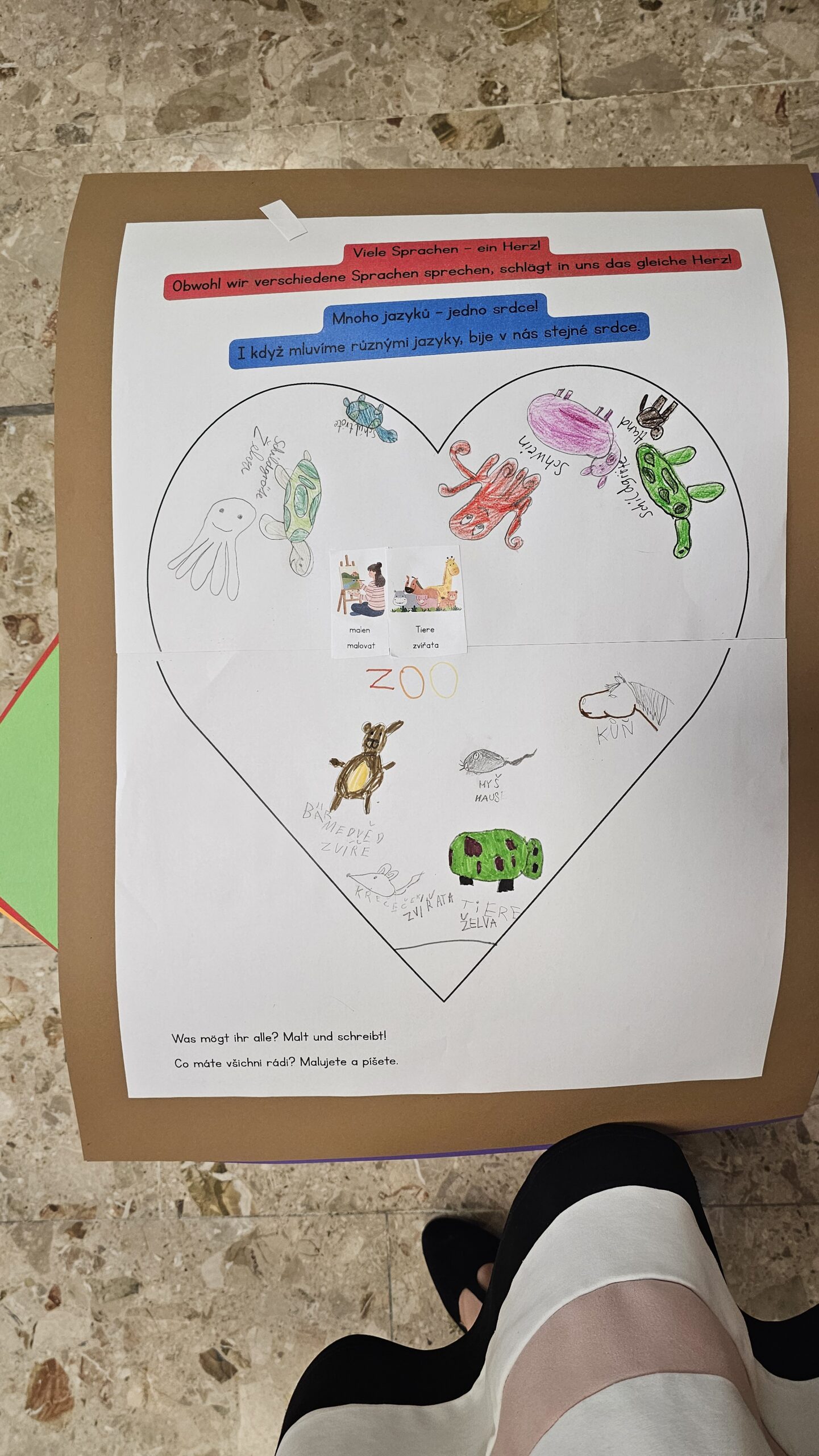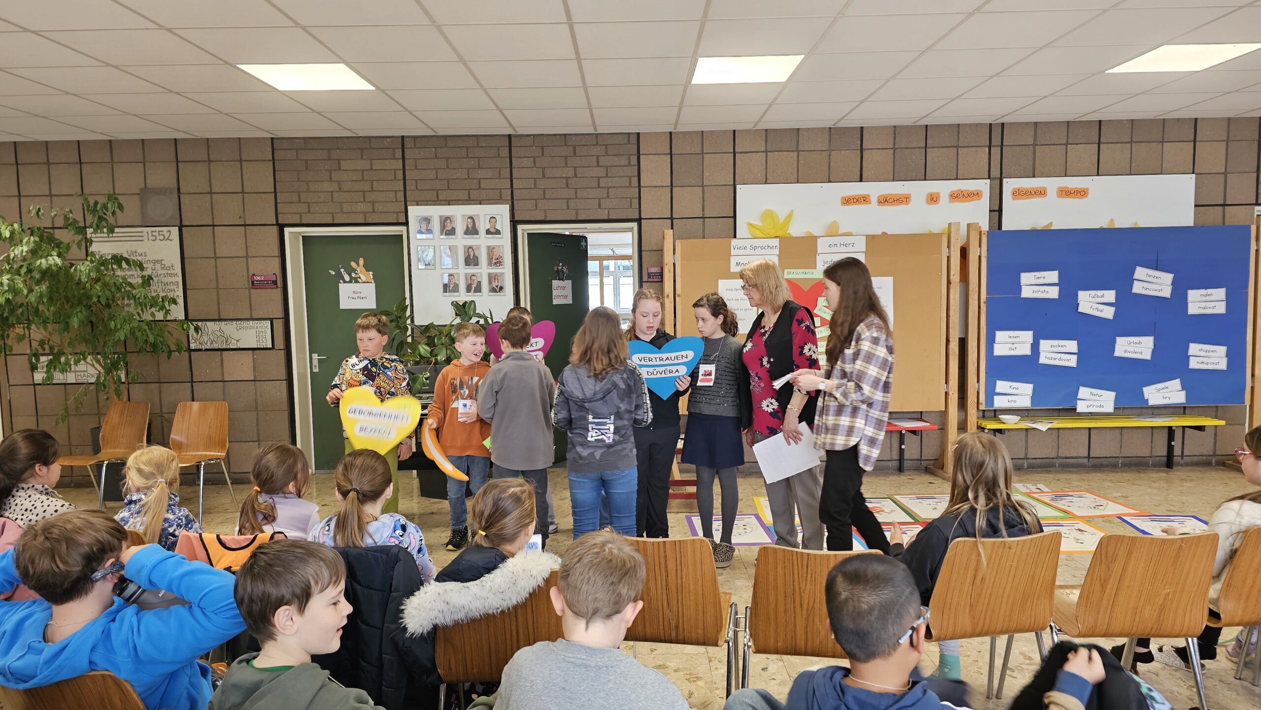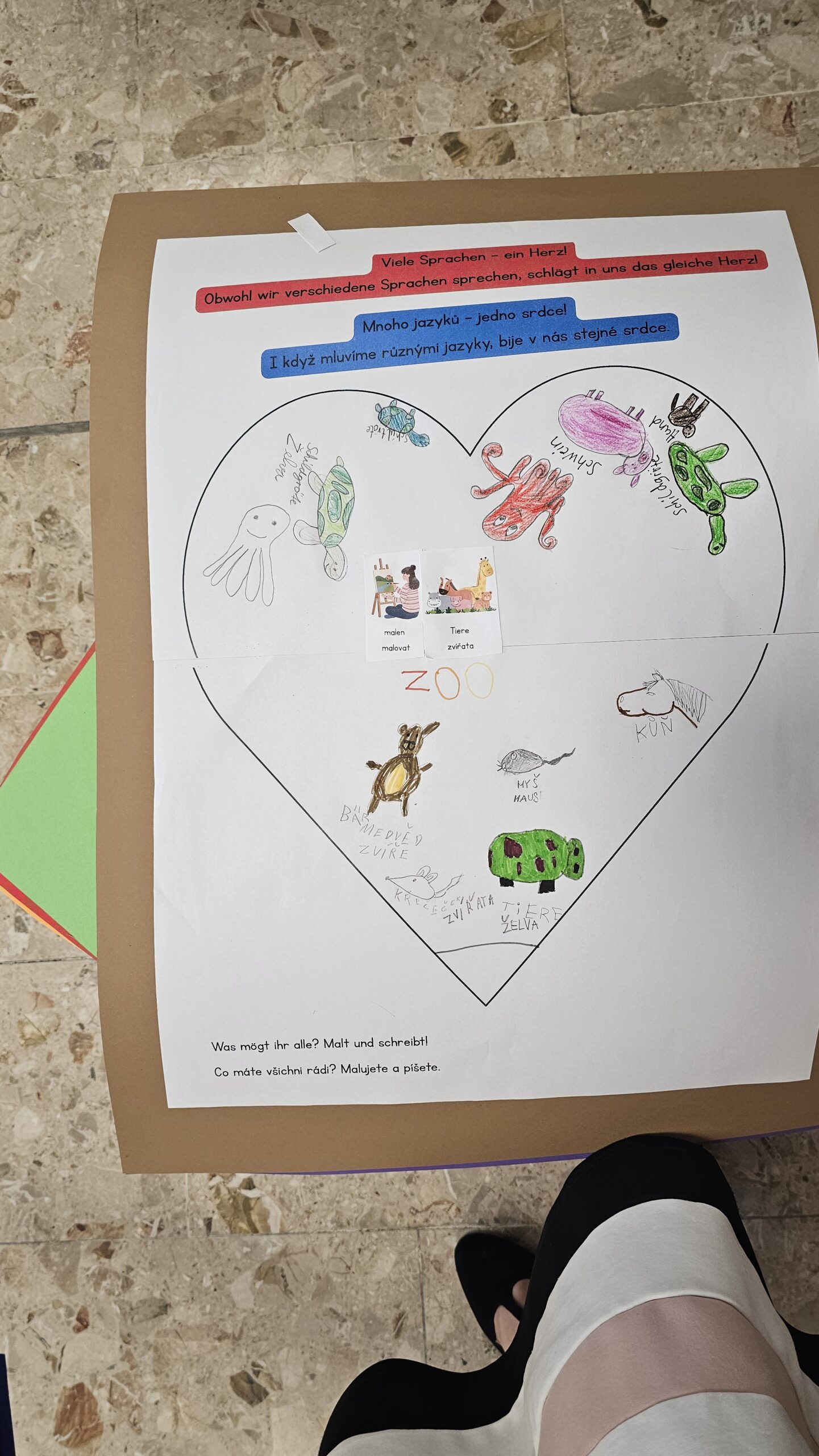 Außerdem gestalteten die Kinder Plakate, die im Gottesdienst präsentiert werden sollen. Ein weiterer Schwerpunkt lag auf der Vorbereitung der Fürbitten und Kyrie-Rufe, die ebenfalls zweisprachig erarbeitet und geübt wurden.
