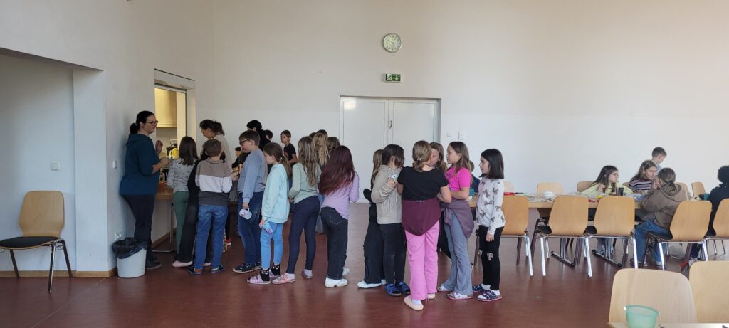 Als die Klassen nach und nach zum Frühstück kamen, staunten die Kinder nicht schlecht: Bunte Platten mit frischen Lebensmitteln luden zum Probieren ein, und der Duft von frisch gebrühtem Tee und Vollkornbrot erfüllte den Raum. Viele Kinder griffen begeistert zu und entdeckten dabei auch Neues – etwa wie lecker Paprika auf einem Brot mit Frischkäse schmecken kann.