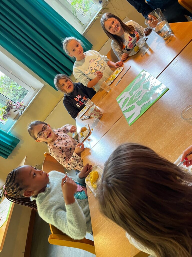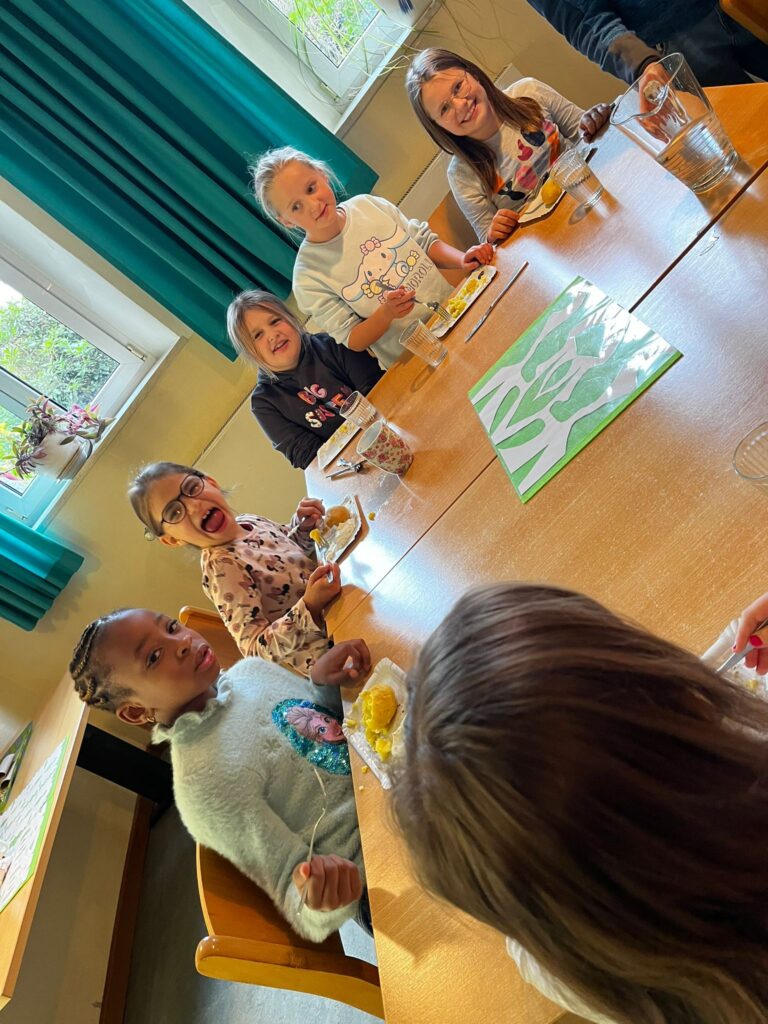 Die EGS-Kinder waren den ganzen Sommer über sehr fleißig auf dem Acker tätig, sodass wir in den letzten Wochen tatkräftig Gemüse ernten konnten. Unser Koch Julian hat bereits Suppe gekocht und heute konnten wir dann die letzte Kartoffelernte in der Schulküche kochen und gleich essen. Mit Quark, Salz oder Butter haben es sich alle Montags-Kinder schmecken lassen.