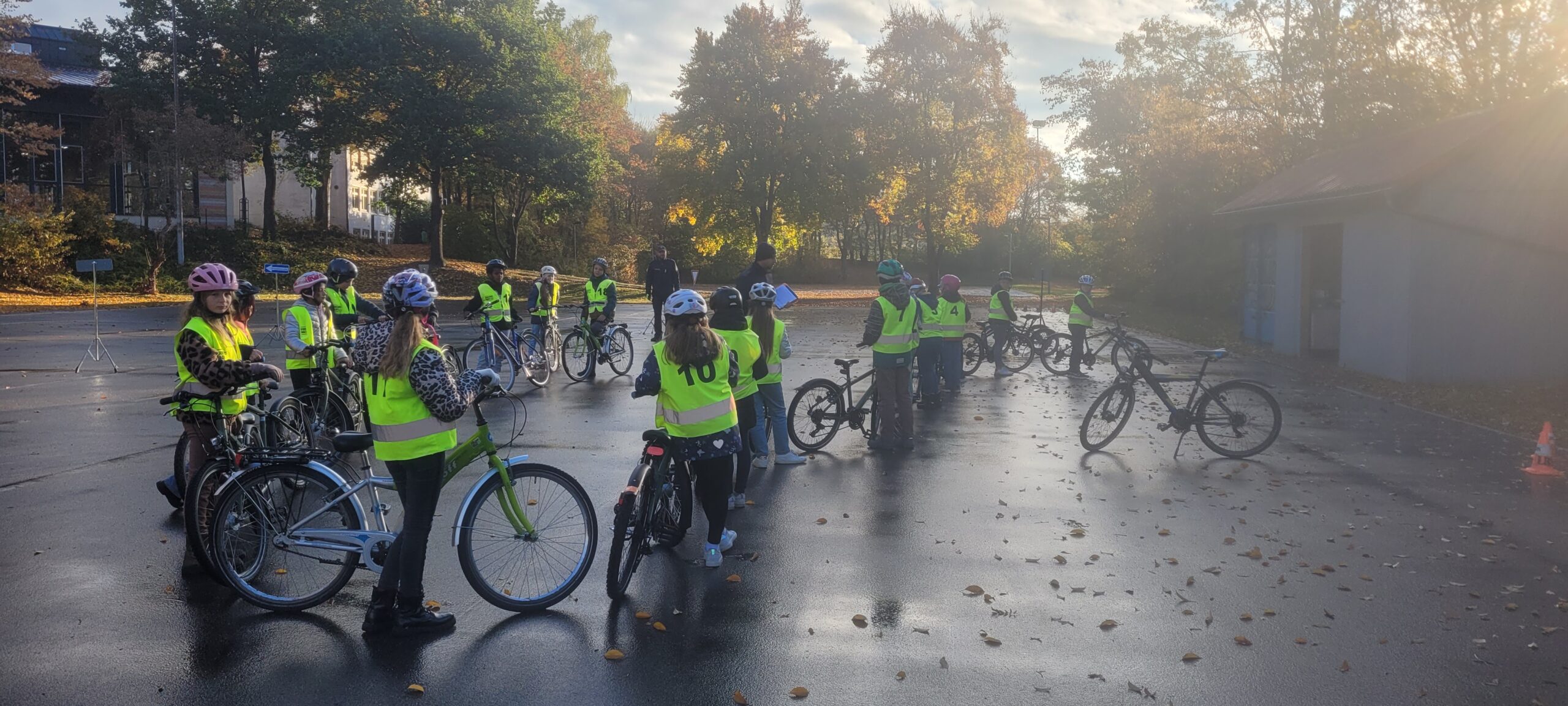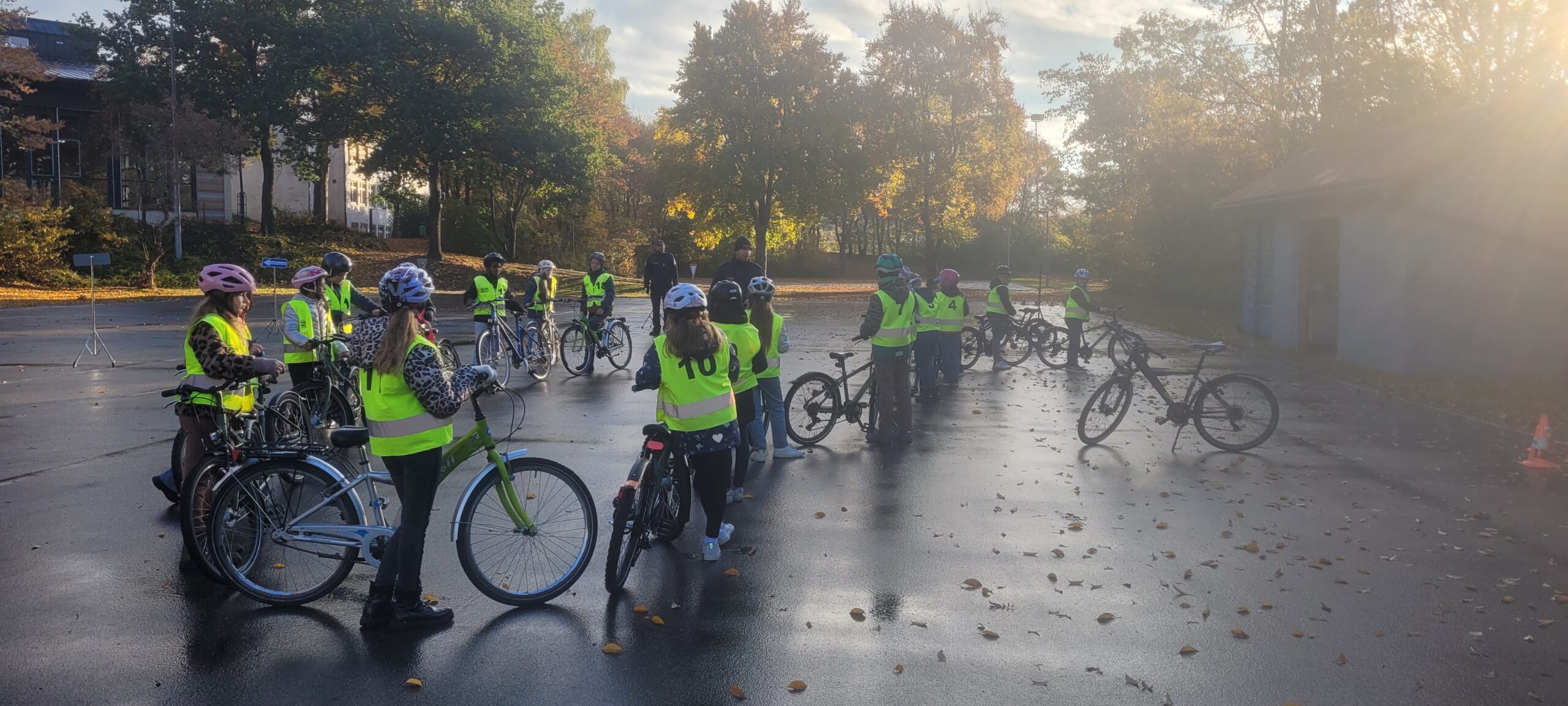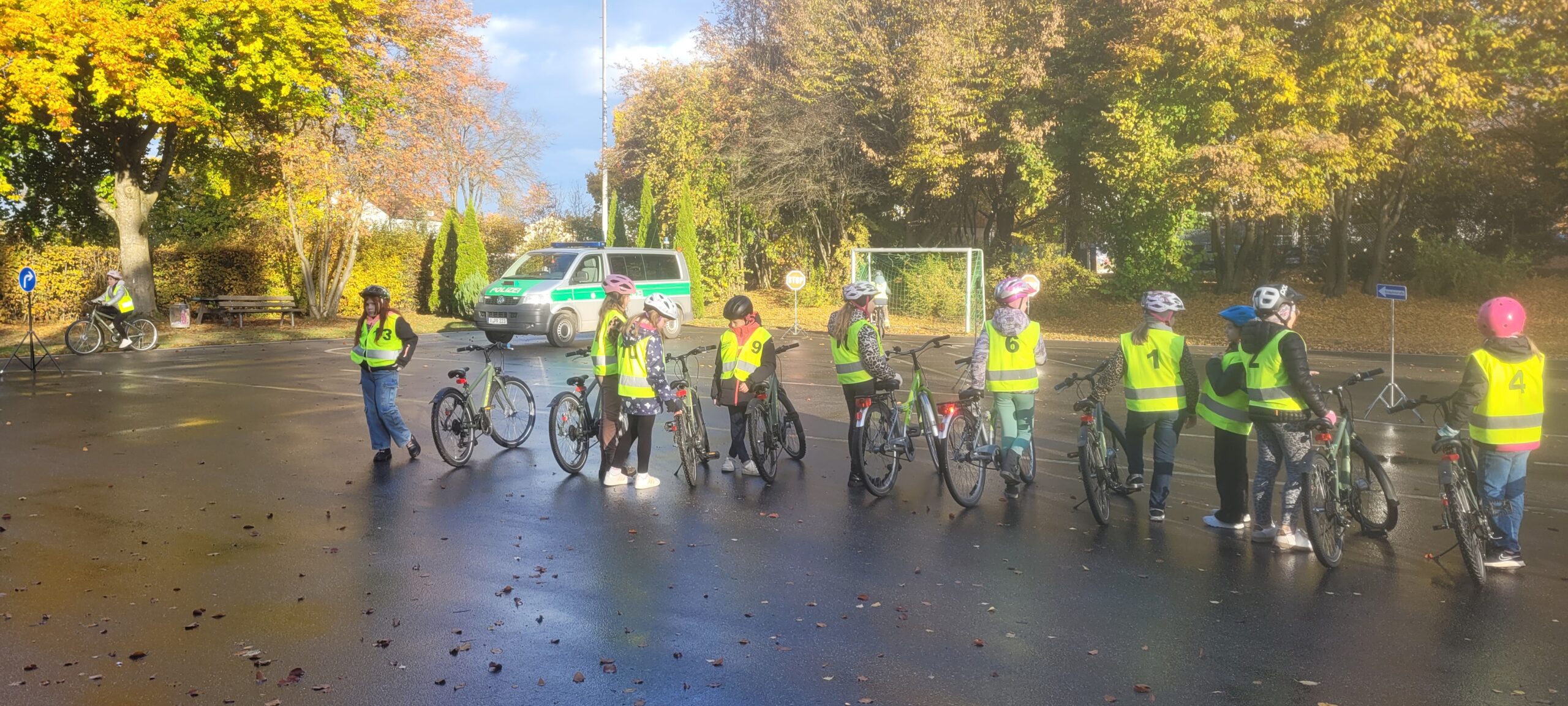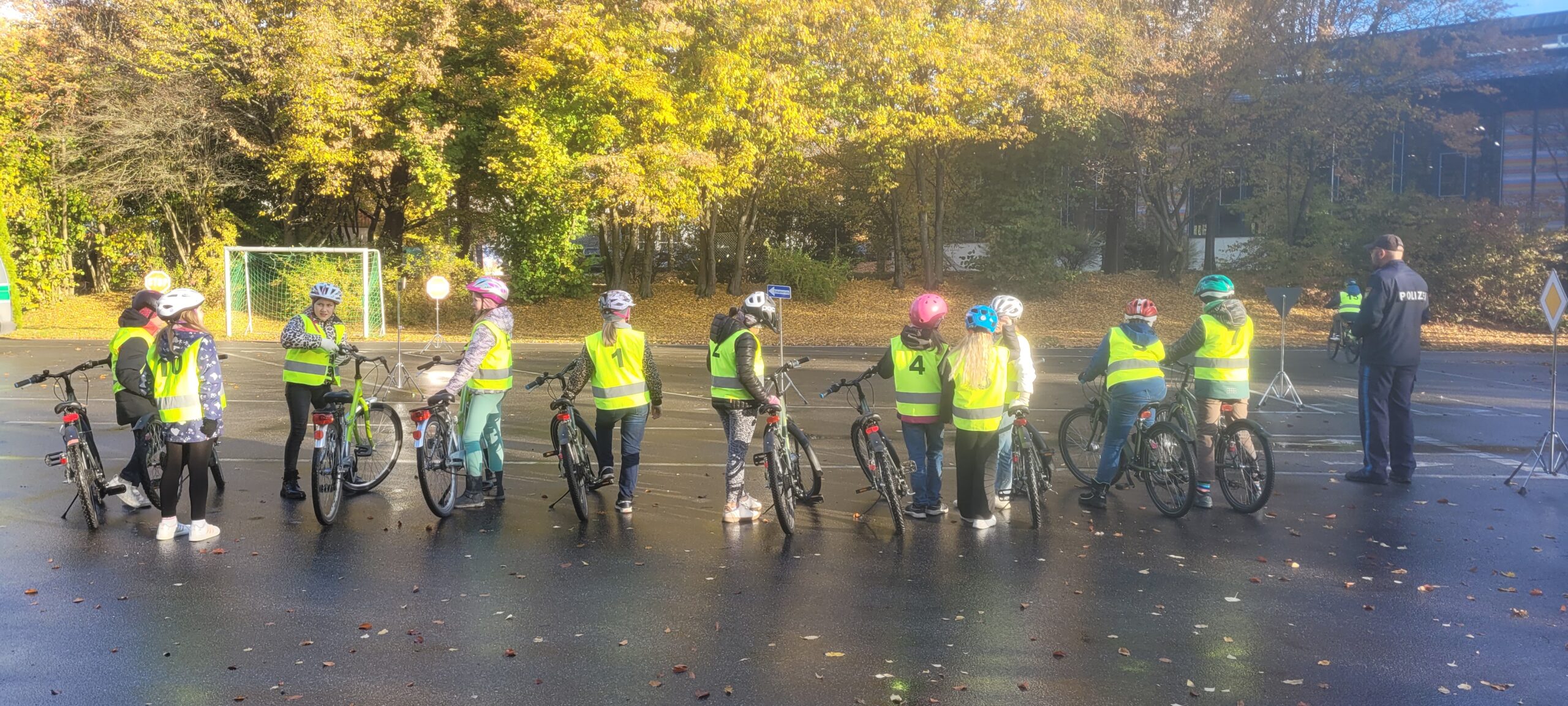 Am Dienstag, den 21.10.2025, fuhren die 4. Klässler sehr nervös nach Vohenstrauß zur Verkehrsschule. Schließlich stand die praktische Fahrradprüfung an. Sie hatten aber keinen Grund dazu. Am Vortag im Klassenzimmer wurden die Schritte des Umfahren eines Hindernisses und des richtigen Linksabbiegens nochmal kleinschrittig besprochen und simuliert, auch bei der mündlichen Wiederholung auf der Hinfahrt im Bus, zeigten die Kinder, dass sie alles im Kopf parat hatten und für die Prüfung gerüstet waren. Im 1. Teil der Prüfung fuhren die Kinder in zwei Gruppen eine vorher eingegangene Strecke nach. Im 2. Teil der Prüfung mussten die Kinder im gesamten Parcours der Verkehrsschule insgesamt 10 Minuten fehlerfrei fahren. Die Polizisten waren sehr nett und halfen noch bei kleinen Missverständnissen. Kurz vor halb zehn war es endlich geschafft und die Polizisten hatten die wenigen Fehlerpunkte für jedes Kind zusammengezählt. So war sicher: Alle Eslarner Kinder haben die praktische Fahrradprüfung mit Erfolg bestanden. Stolz und sehr erleichtert fuhren die Schützlinge mit Frau Bauer wieder an die Schule zurück.