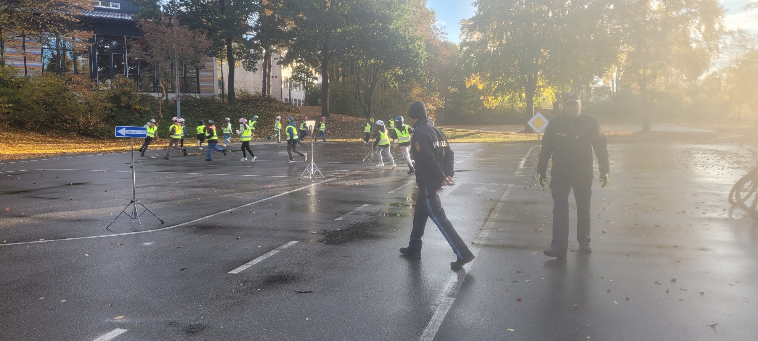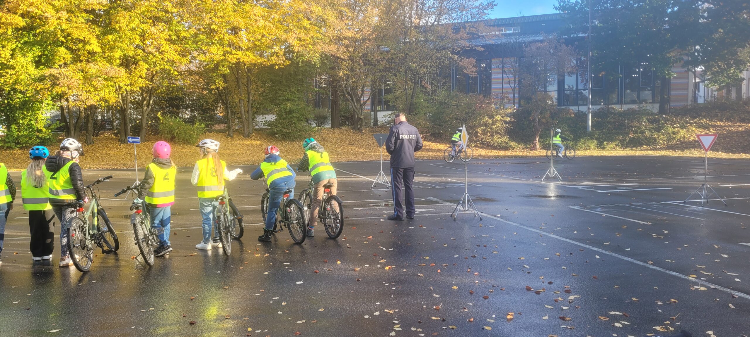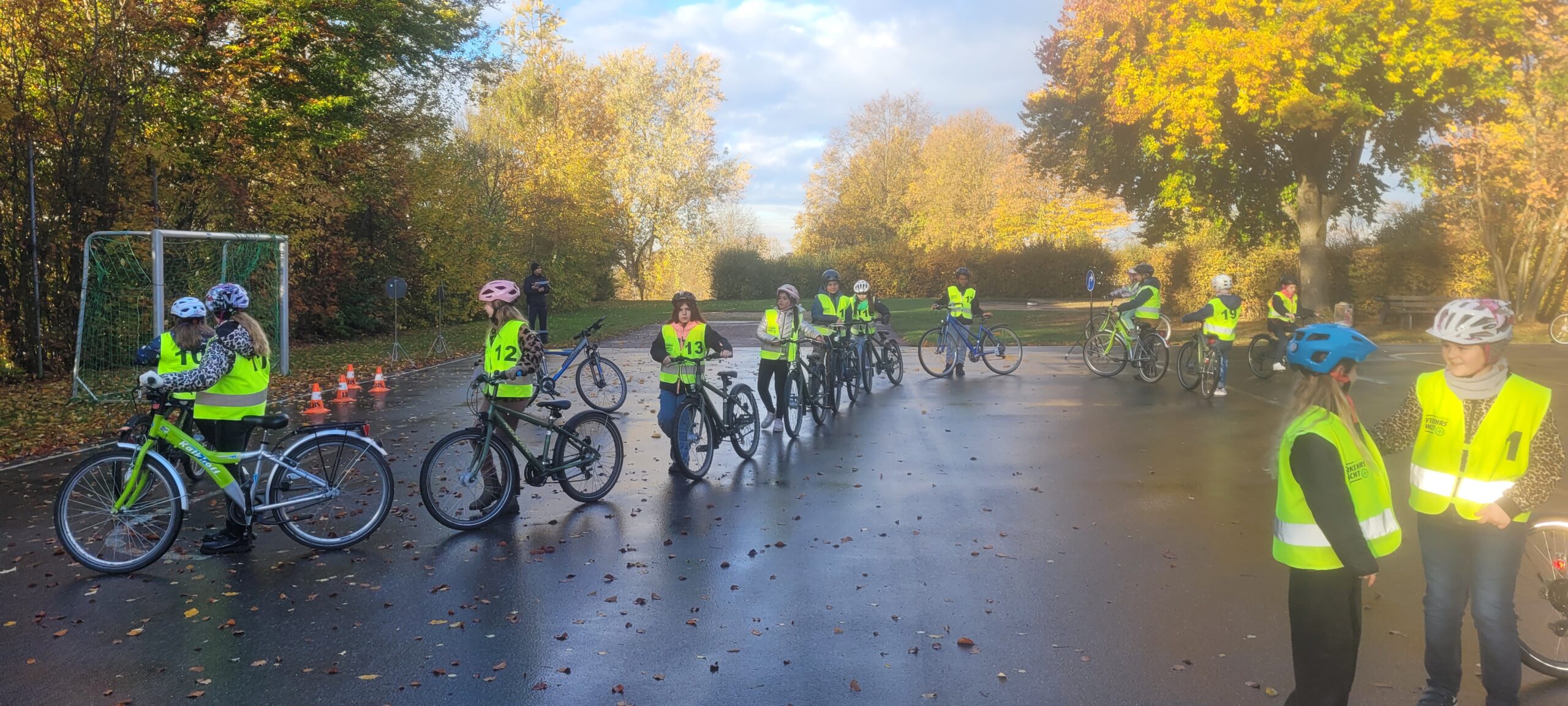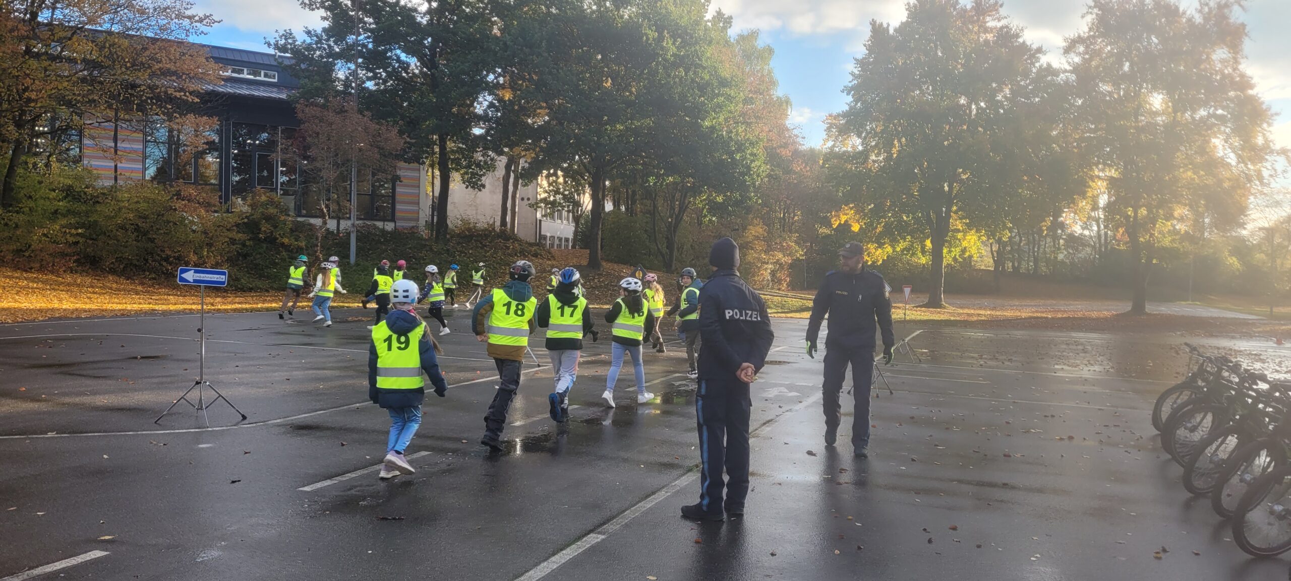 Am Dienstag, den 21.10.2025, fuhren die 4. Klässler sehr nervös nach Vohenstrauß zur Verkehrsschule. Schließlich stand die praktische Fahrradprüfung an. Sie hatten aber keinen Grund dazu. Am Vortag im Klassenzimmer wurden die Schritte des Umfahren eines Hindernisses und des richtigen Linksabbiegens nochmal kleinschrittig besprochen und simuliert, auch bei der mündlichen Wiederholung auf der Hinfahrt im Bus, zeigten die Kinder, dass sie alles im Kopf parat hatten und für die Prüfung gerüstet waren. Im 1. Teil der Prüfung fuhren die Kinder in zwei Gruppen eine vorher eingegangene Strecke nach. Im 2. Teil der Prüfung mussten die Kinder im gesamten Parcours der Verkehrsschule insgesamt 10 Minuten fehlerfrei fahren. Die Polizisten waren sehr nett und halfen noch bei kleinen Missverständnissen. Kurz vor halb zehn war es endlich geschafft und die Polizisten hatten die wenigen Fehlerpunkte für jedes Kind zusammengezählt. So war sicher: Alle Eslarner Kinder haben die praktische Fahrradprüfung mit Erfolg bestanden. Stolz und sehr erleichtert fuhren die Schützlinge mit Frau Bauer wieder an die Schule zurück.