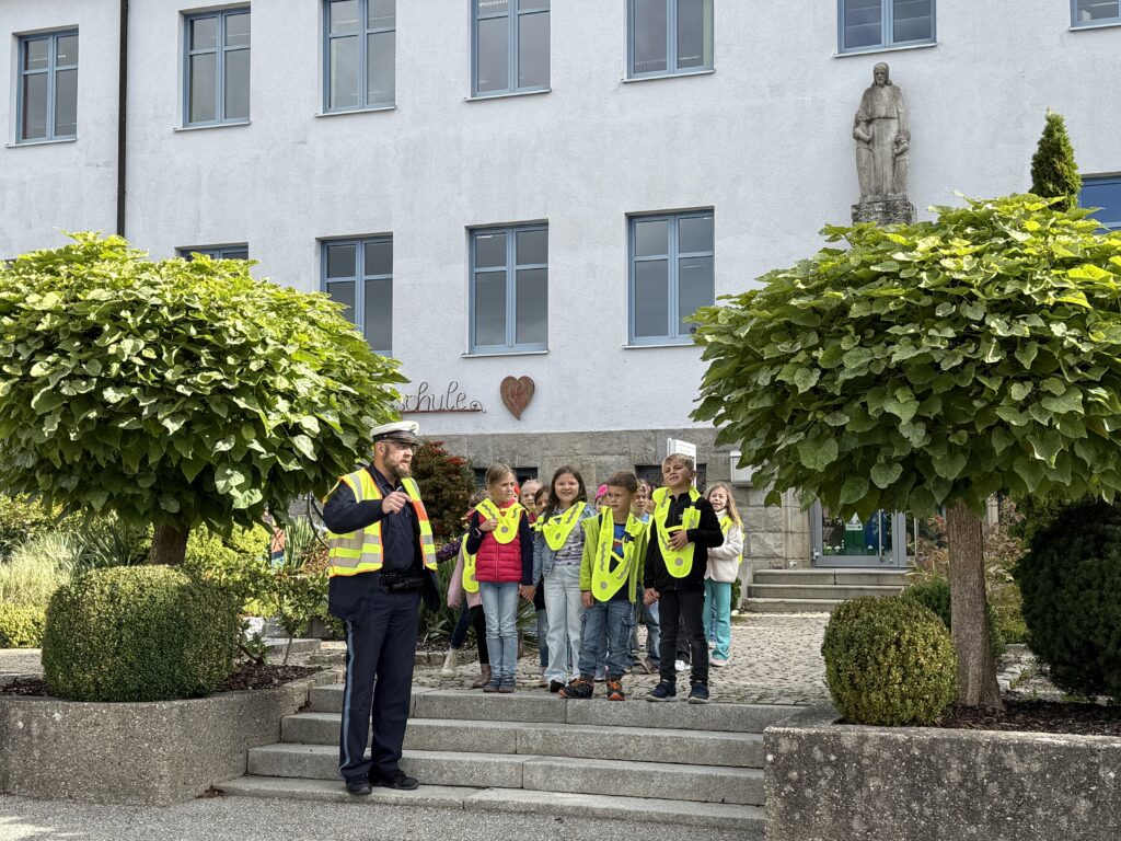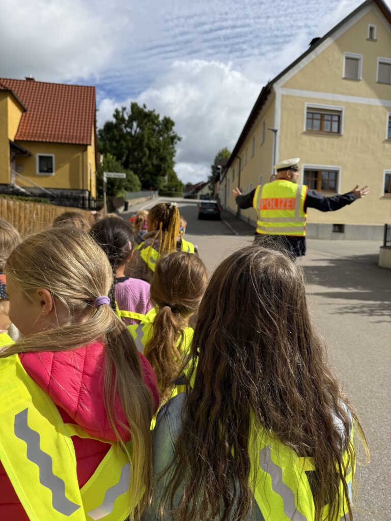 Am zweiten Schultag hatten die Kinder der ersten Klasse dann selbst einen besonderen Termin: Gemeinsam mit dem Verkehrspolizisten Herrn Wolfgang Piehler machten sie eine Schulwegbegehung durch Eslarn.