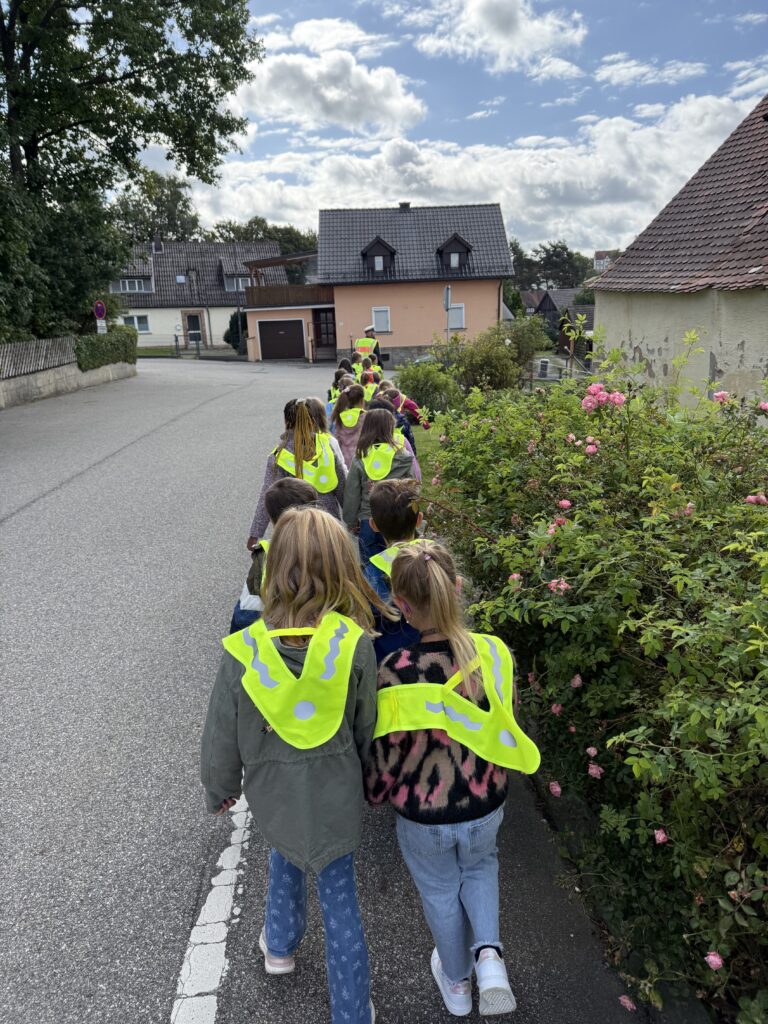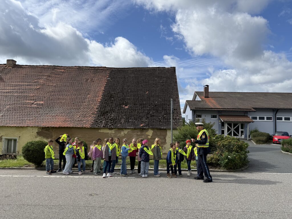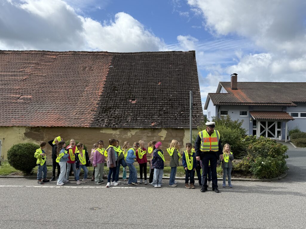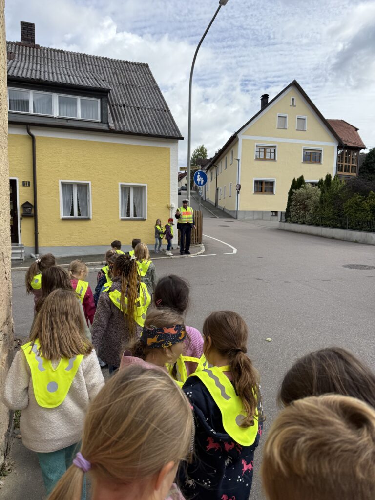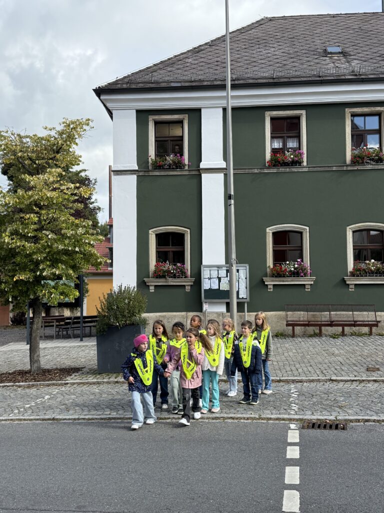 Herr Piehler zeigte den Kindern, wie man richtig über die Straße geht: Erst nach links, dann nach rechts und wieder nach links schauen – und erst losgehen, wenn die Straße frei ist. Besonders wichtig war auch das Überqueren der Hauptstraße. Dort übten die Kinder, aufmerksam zu bleiben und immer auf den Verkehr zu achten.