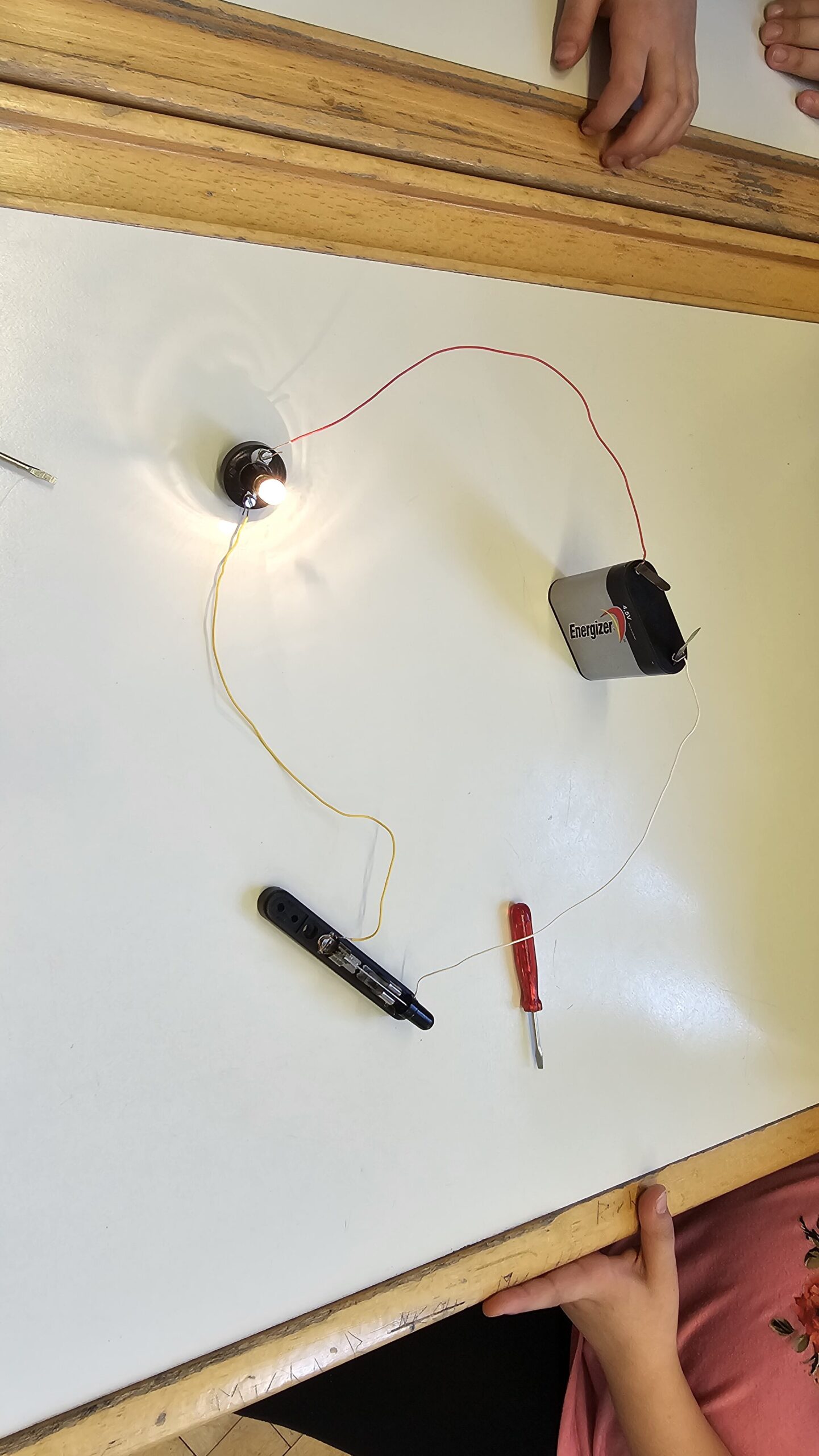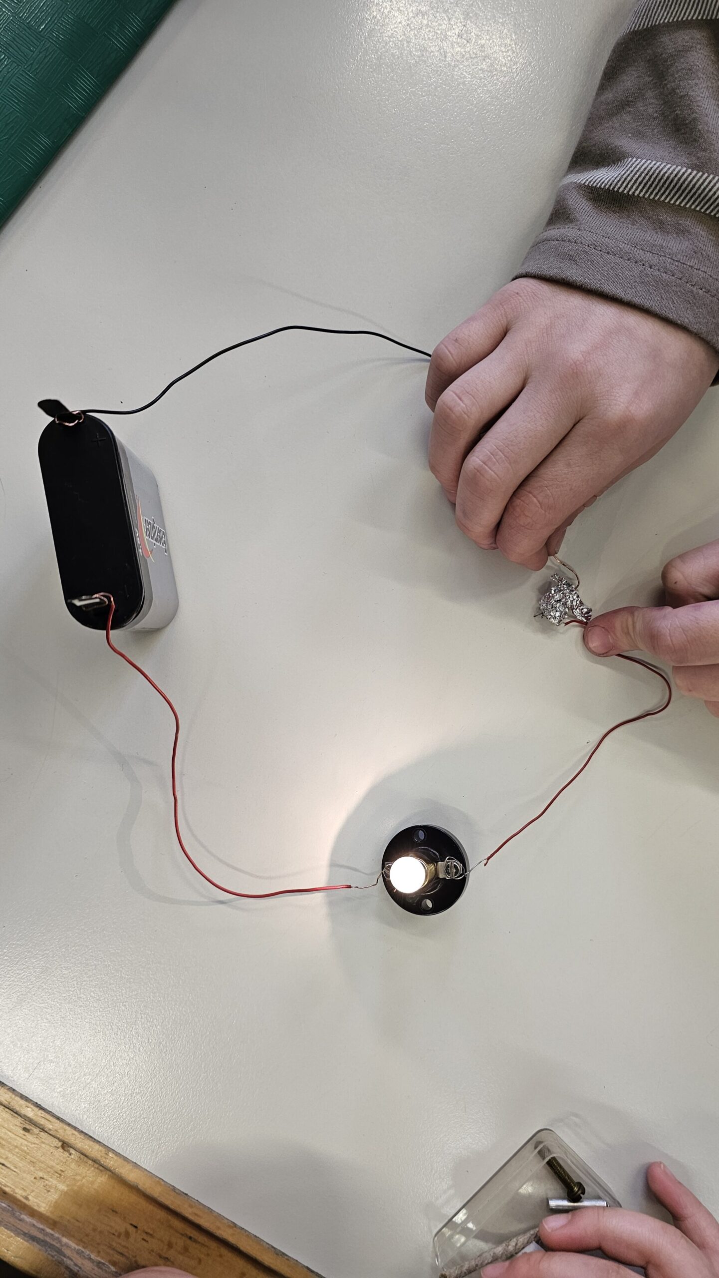 Ein besonderes Highlight ist der Bau von Schaltern. Die Kinder überlegen gemeinsam, wie man einen Stromkreis unterbrechen und wieder schließen kann, und setzen ihre Ideen kreativ um. Dabei entstehen ganz unterschiedliche Lösungen, die im Anschluss ausprobiert und besprochen werden.