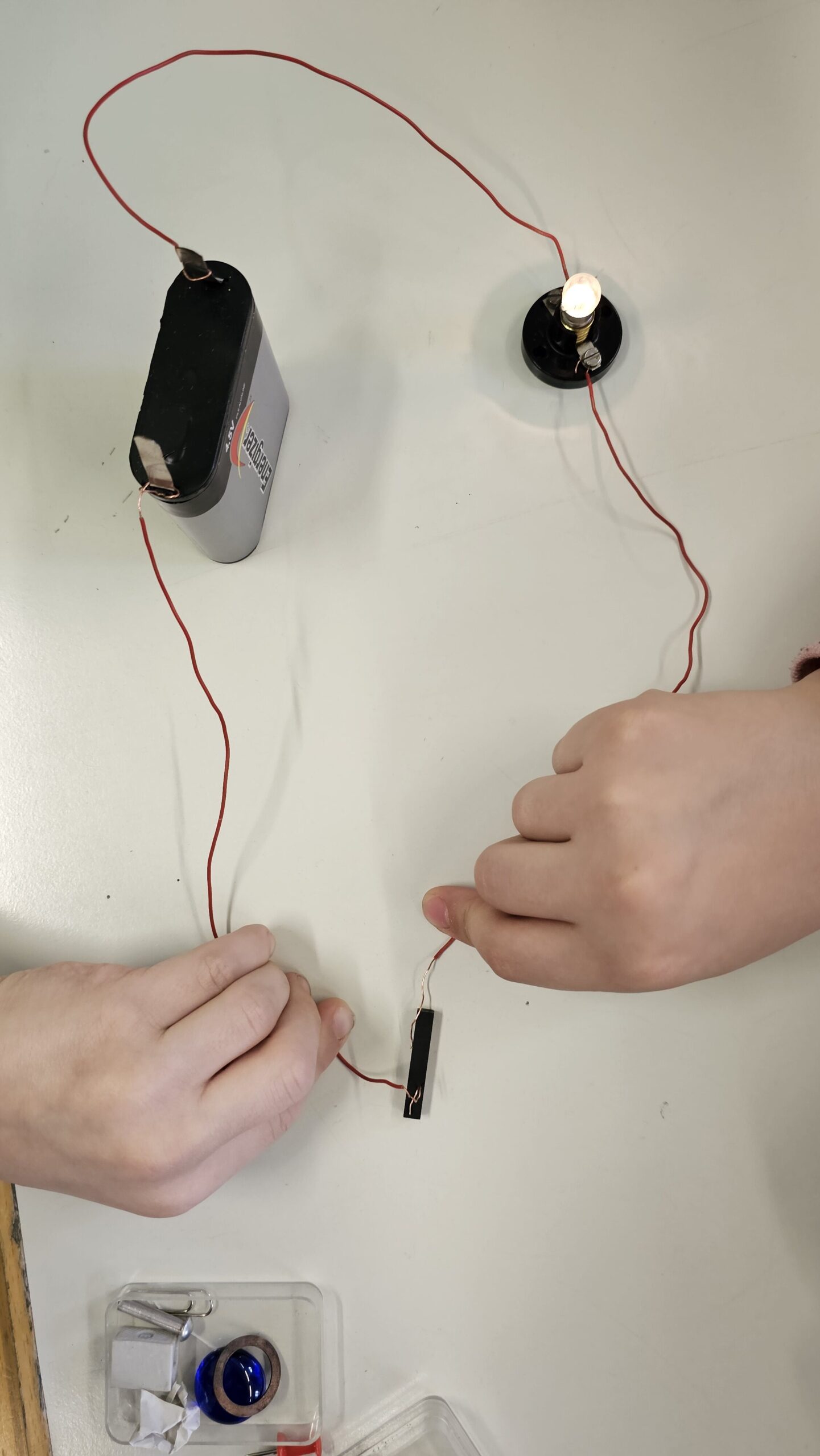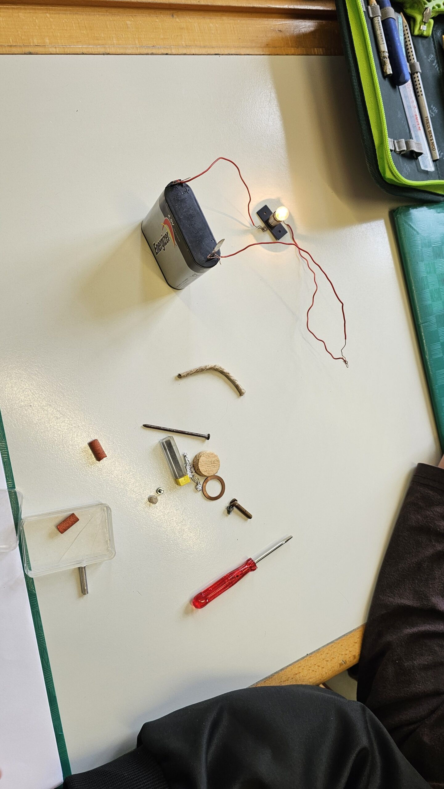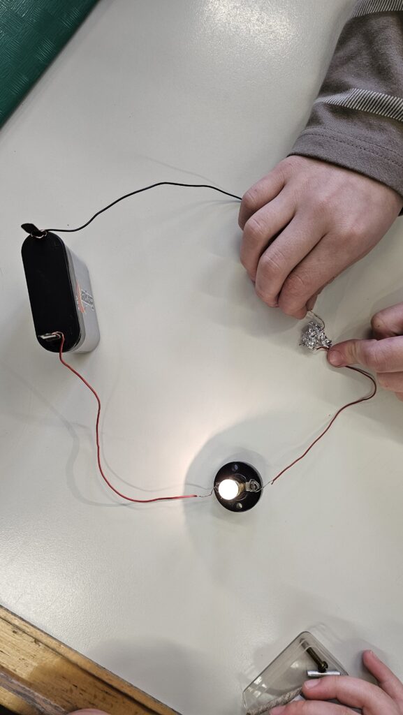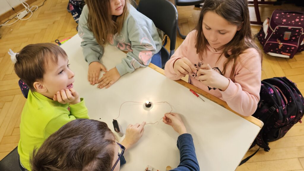 Anstatt nur aus dem Buch zu lernen, wird bei uns vor allem praktisch gearbeitet. Die Kinder bauen eigene Stromkreise und erfahren so ganz anschaulich, wie elektrischer Strom überhaupt fließen kann. Mit Batterien, Kabeln und kleinen Lämpchen gelingt es ihnen, erste einfache Schaltungen zum Leuchten zu bringen – ein echtes Erfolgserlebnis!