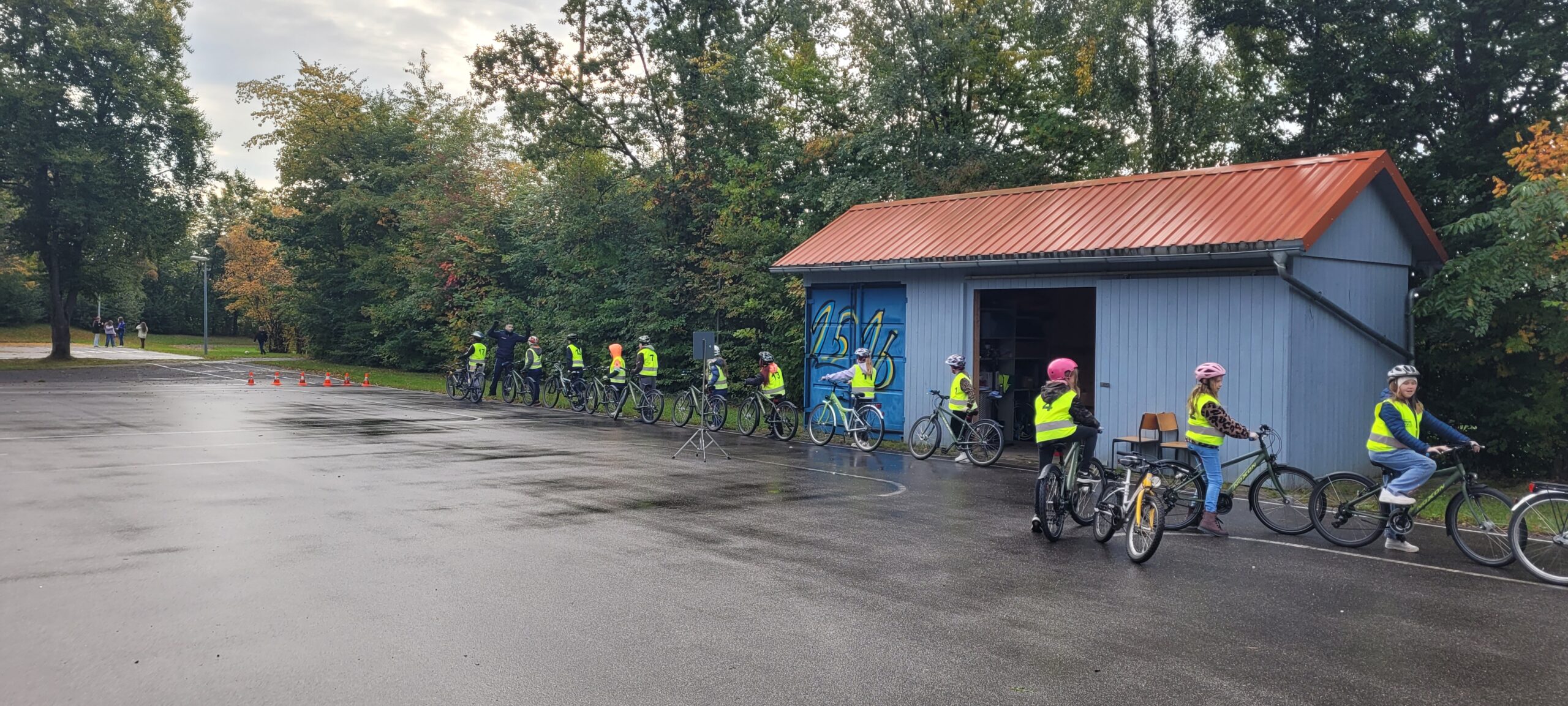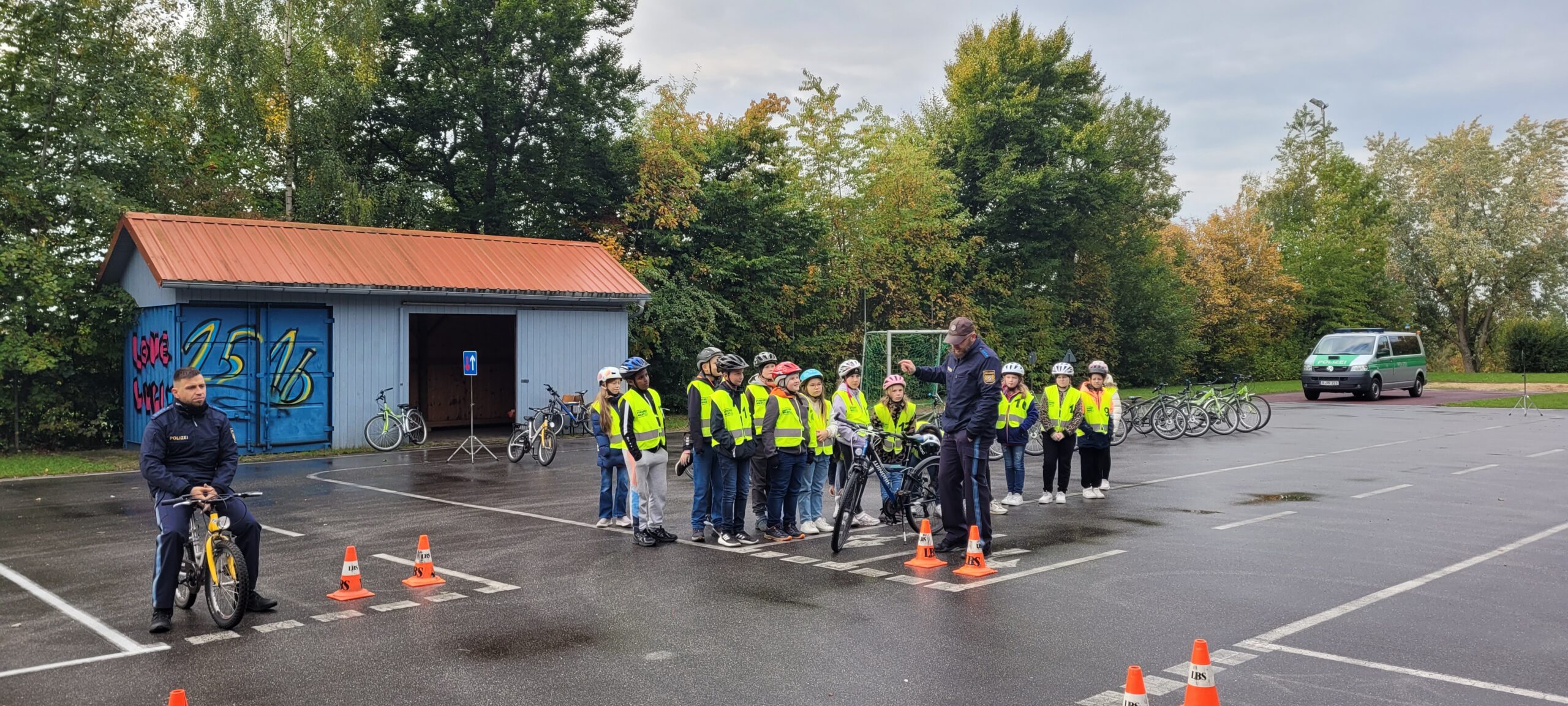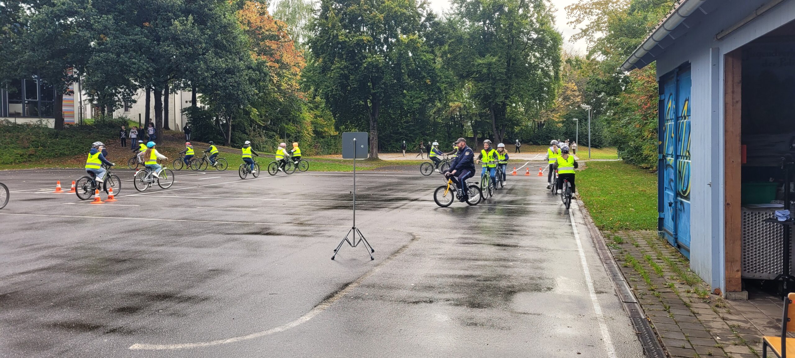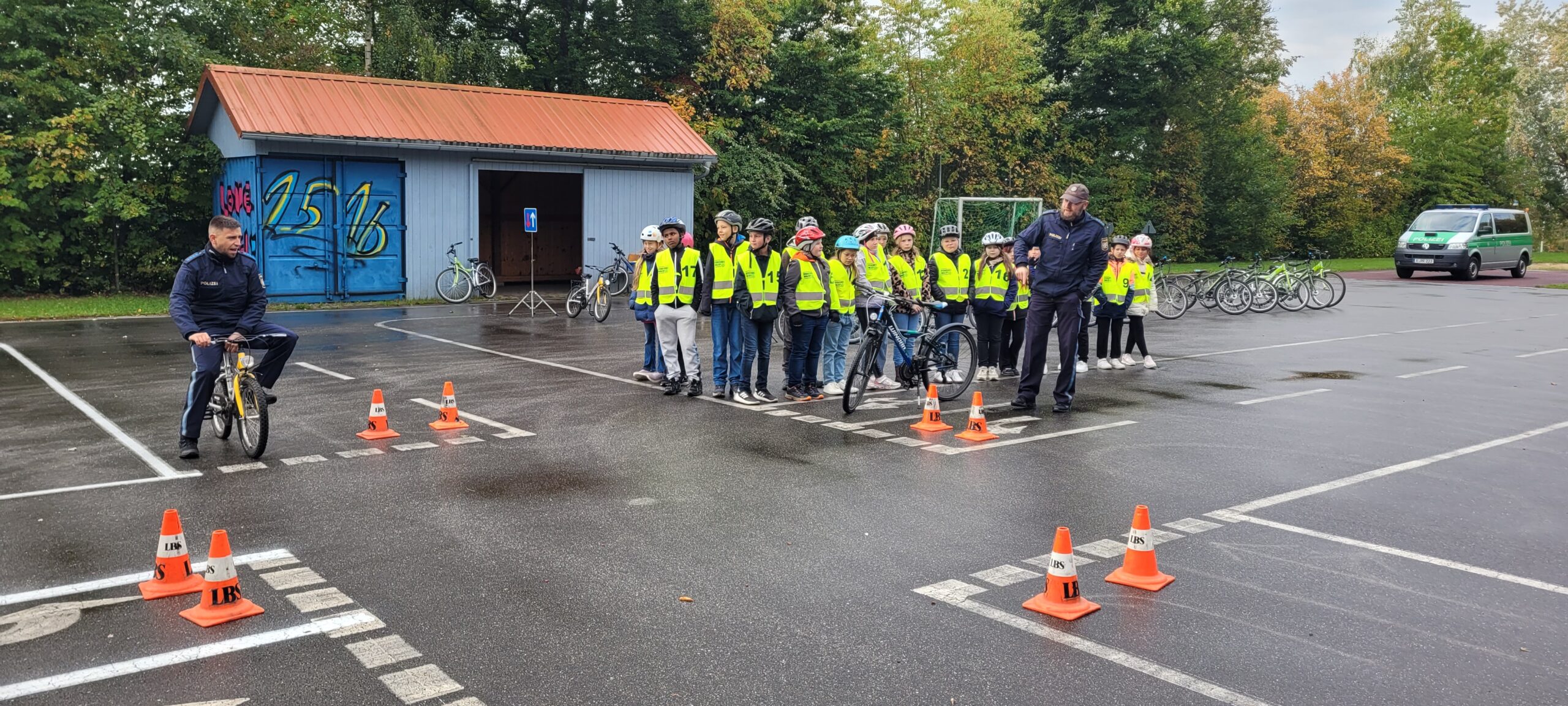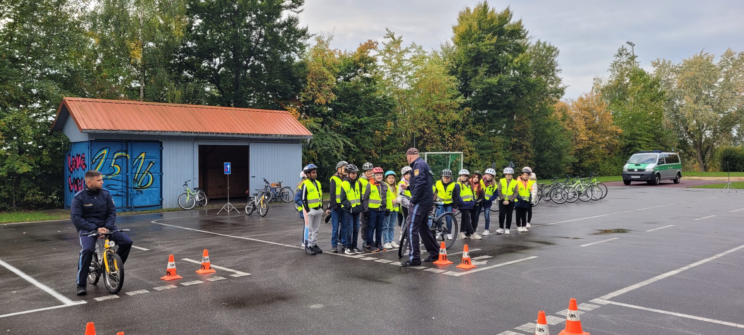 Am Dienstag, den 30.09.25, machte sich die 4. Klasse das erste Mal auf zur Verkehrsschule nach Vohenstrauß. Die Kinder waren voller Vorfreude und zeigten während der ersten beiden Unterrichtseinheiten größte Motivation und erzählten voller Eifer, was sie schon alles wissen. Auch wenn beim 1. Mal Verkehrsschule noch viel erklärt wird, versuchten die Kinder alle Fragen der beiden Polizisten zu beantworten, die sehr anschaulich und mit dem nötigen Humor die Viertklässler im Schonraumparcours an Verkehrssituationen heranführten. Zum Schluss durfte auch sogar noch mit dem Fahrrad gefahren werden. Da schon auf die ersten Verkehrsschilder und die Vorfahrtsregel „Rechts vor links“ geachtet werden musste, wurde schnell klar, dass man im Straßenparcours viel denken muss und „Rasen“ kein guter Ratgeber ist.