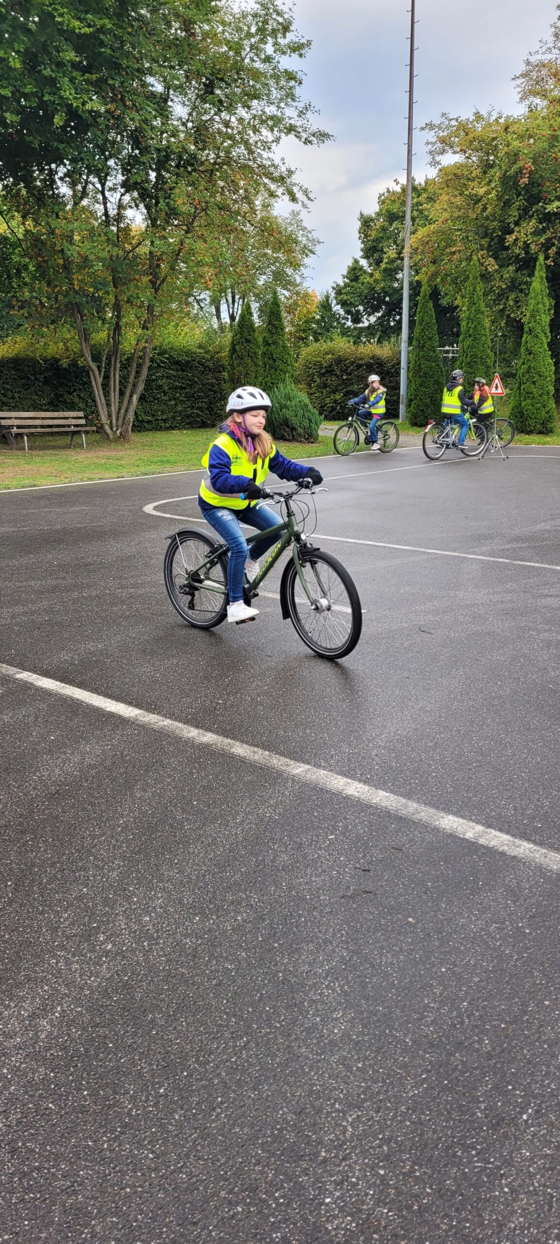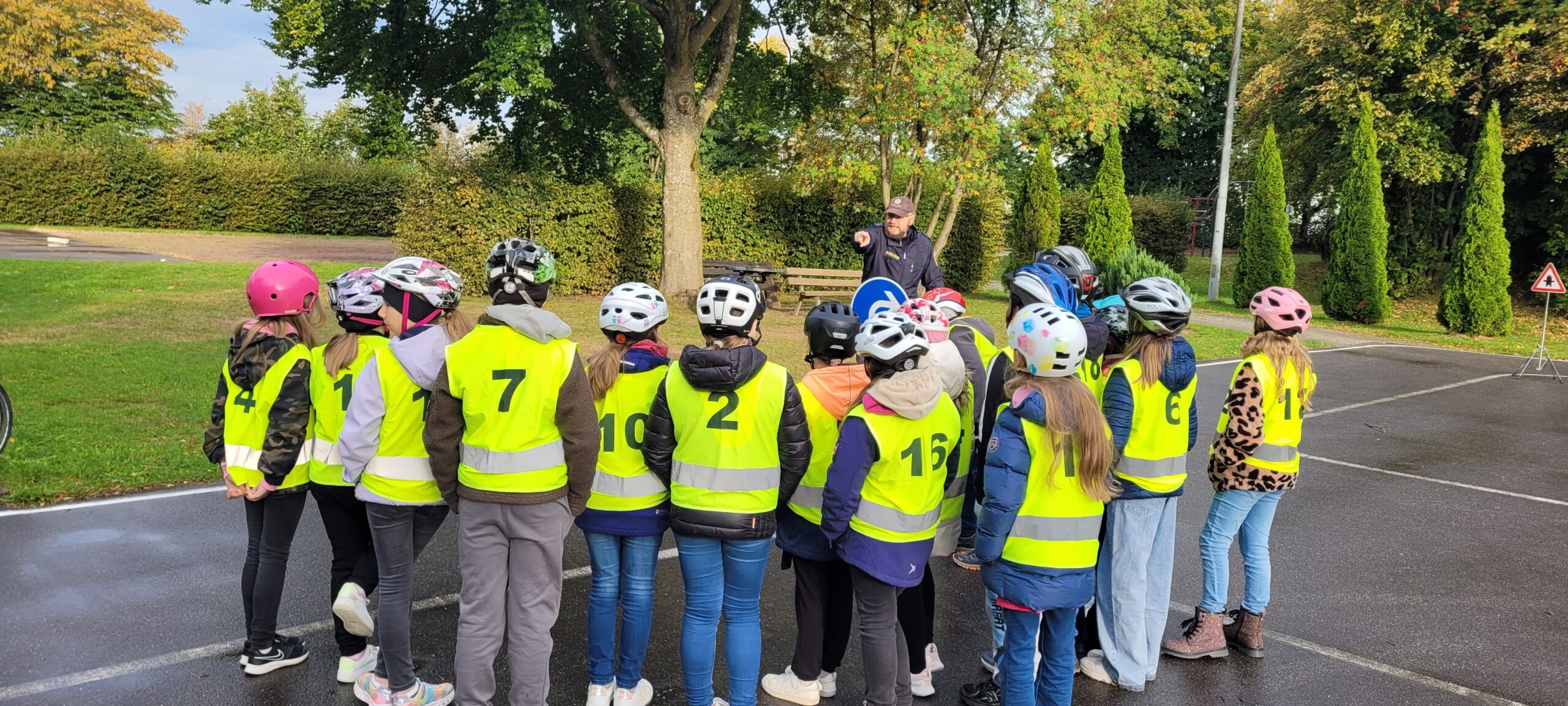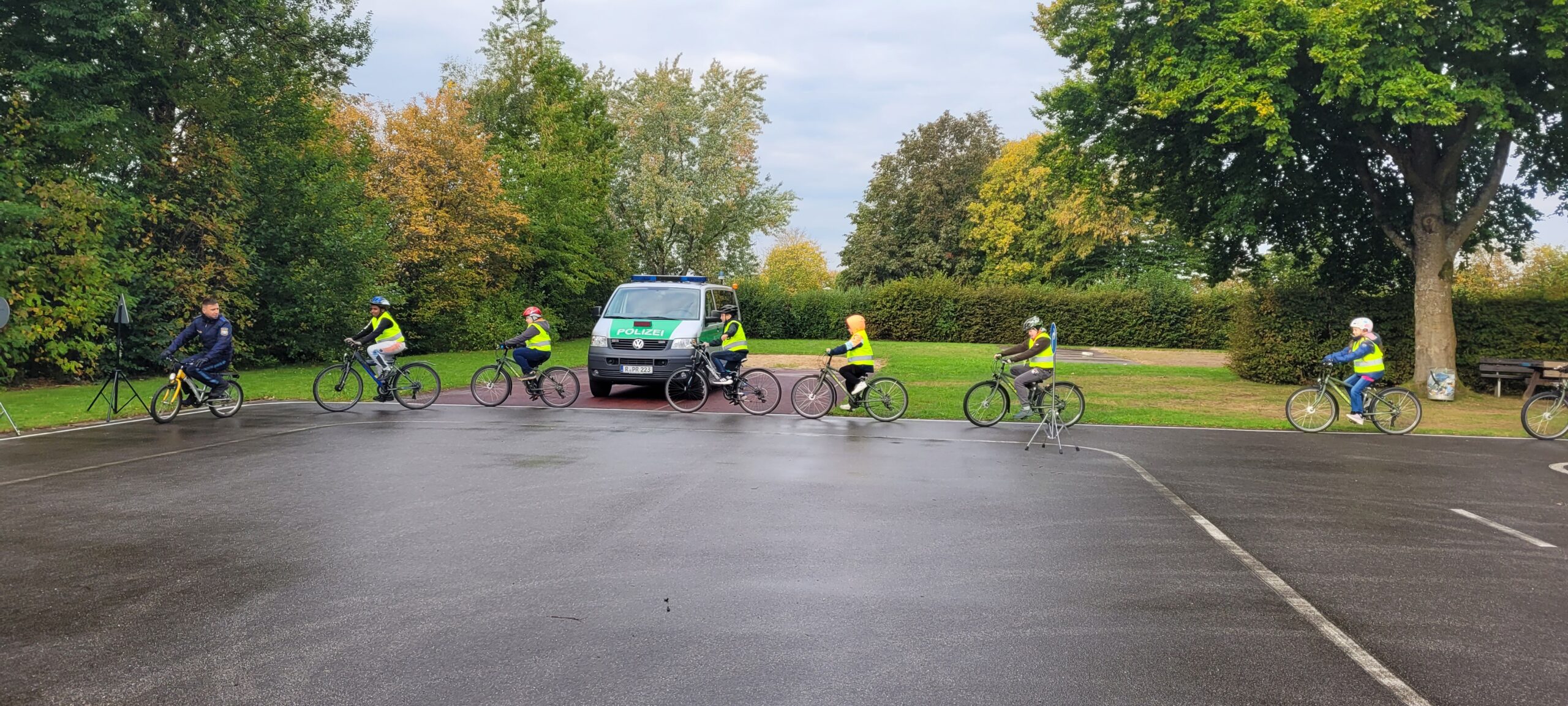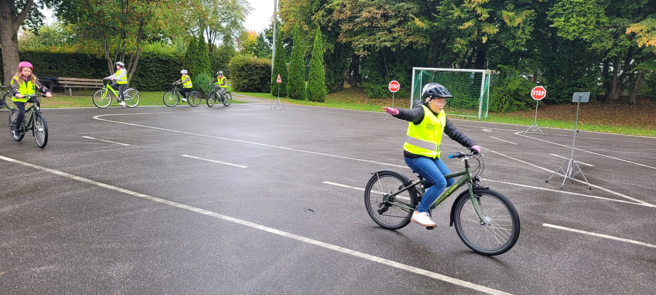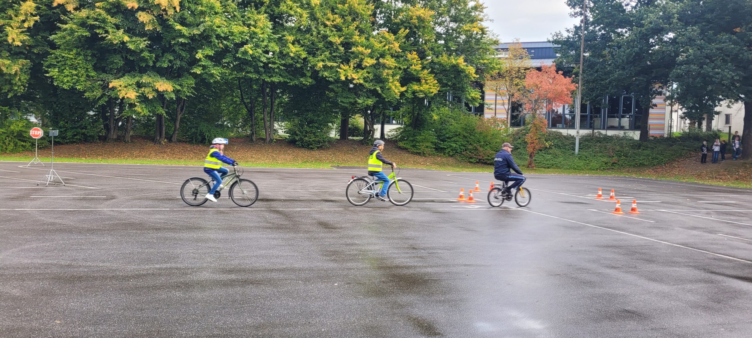Am Dienstag, den 30.09.25, machte sich die 4. Klasse das erste Mal auf zur Verkehrsschule nach Vohenstrauß. Die Kinder waren voller Vorfreude und zeigten während der ersten beiden Unterrichtseinheiten größte Motivation und erzählten voller Eifer, was sie schon alles wissen. Auch wenn beim 1. Mal Verkehrsschule noch viel erklärt wird, versuchten die Kinder alle Fragen der beiden Polizisten zu beantworten, die sehr anschaulich und mit dem nötigen Humor die Viertklässler im Schonraumparcours an Verkehrssituationen heranführten. Zum Schluss durfte auch sogar noch mit dem Fahrrad gefahren werden. Da schon auf die ersten Verkehrsschilder und die Vorfahrtsregel „Rechts vor links“ geachtet werden musste, wurde schnell klar, dass man im Straßenparcours viel denken muss und „Rasen“ kein guter Ratgeber ist.