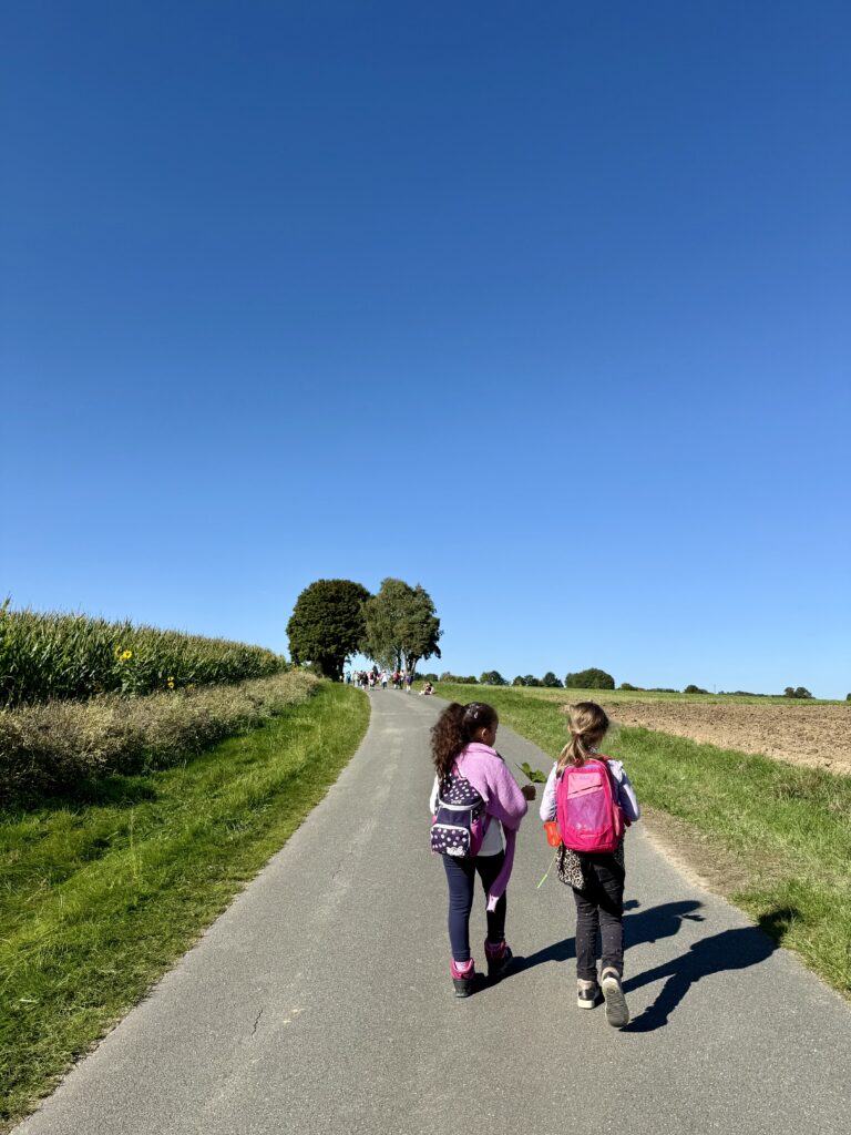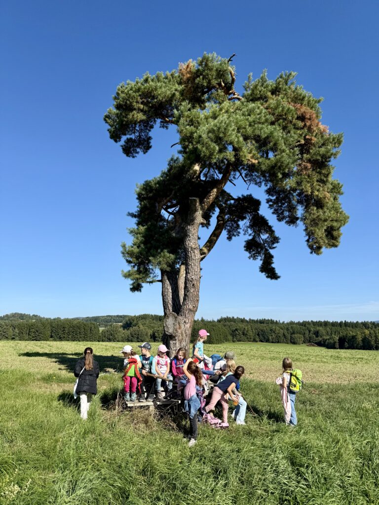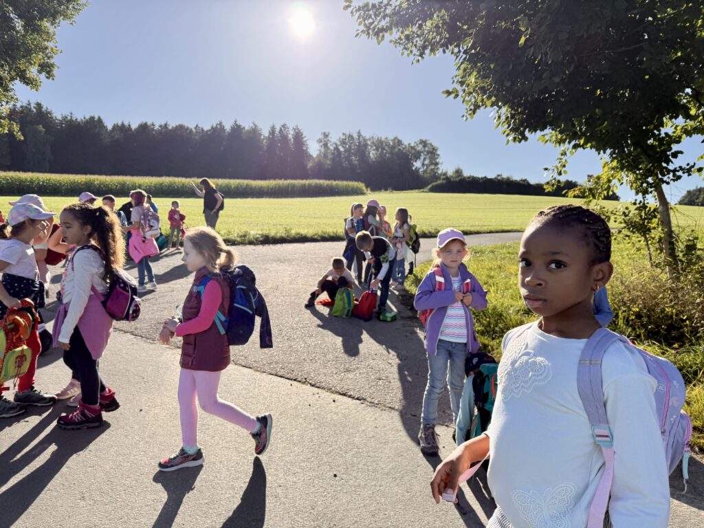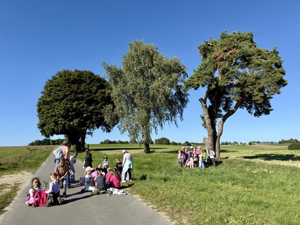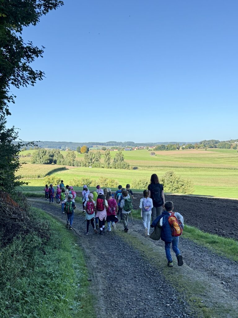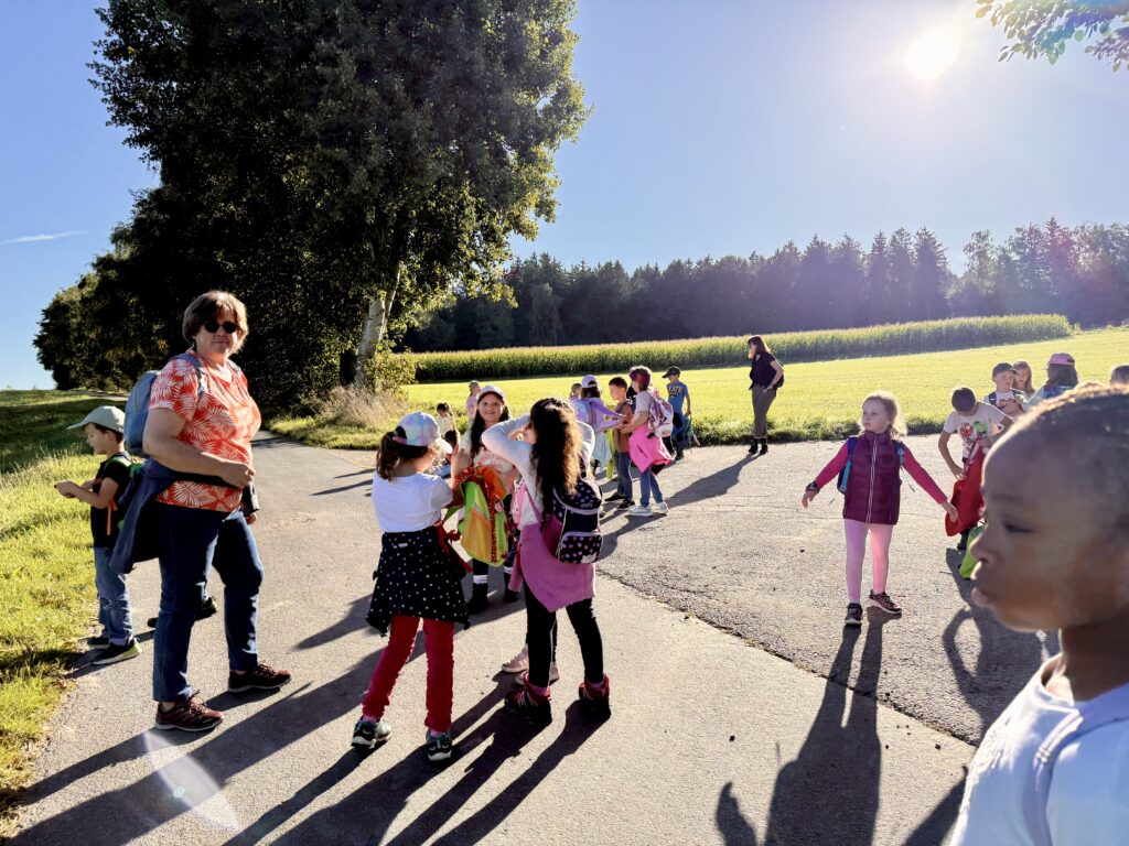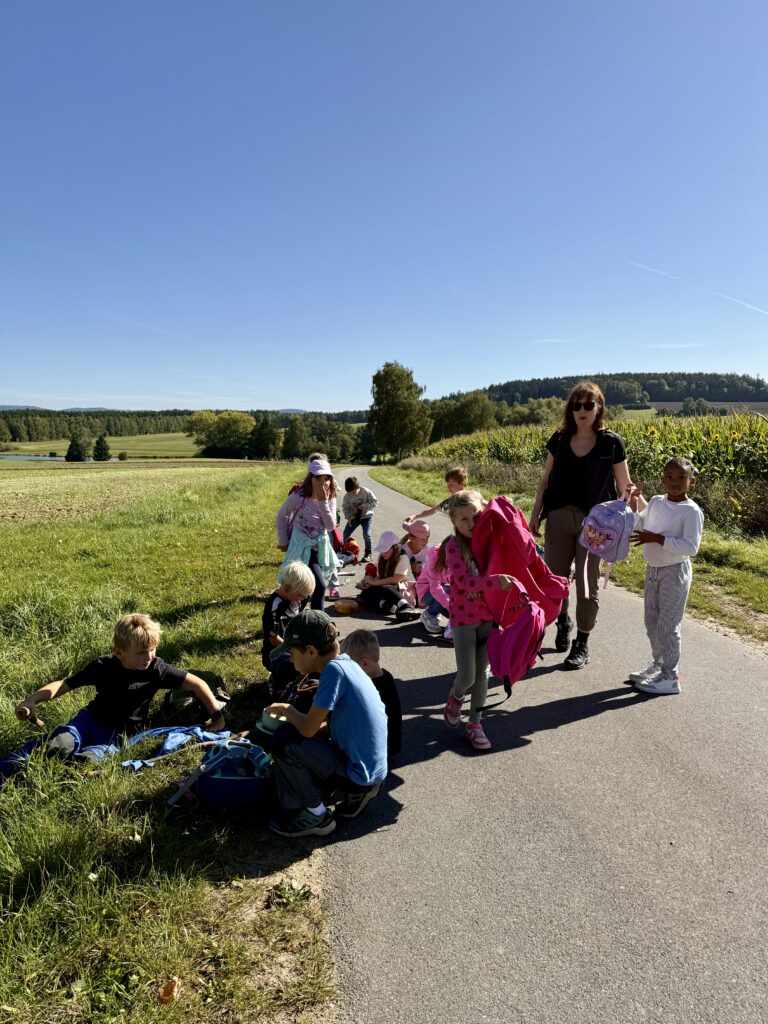 Unsere Route führte uns bei strahlendem Sonnenschein und blauem Himmel in Richtung Matthesenweiher. Von dort ging es in einer großen, schönen Runde, unterbrochen von mehreren kleinen Brotzeitpausen, wieder zurück zur Schule. Insgesamt waren wir über sechs Kilometer unterwegs – eine richtige Leistung für alle kleinen Wanderer!