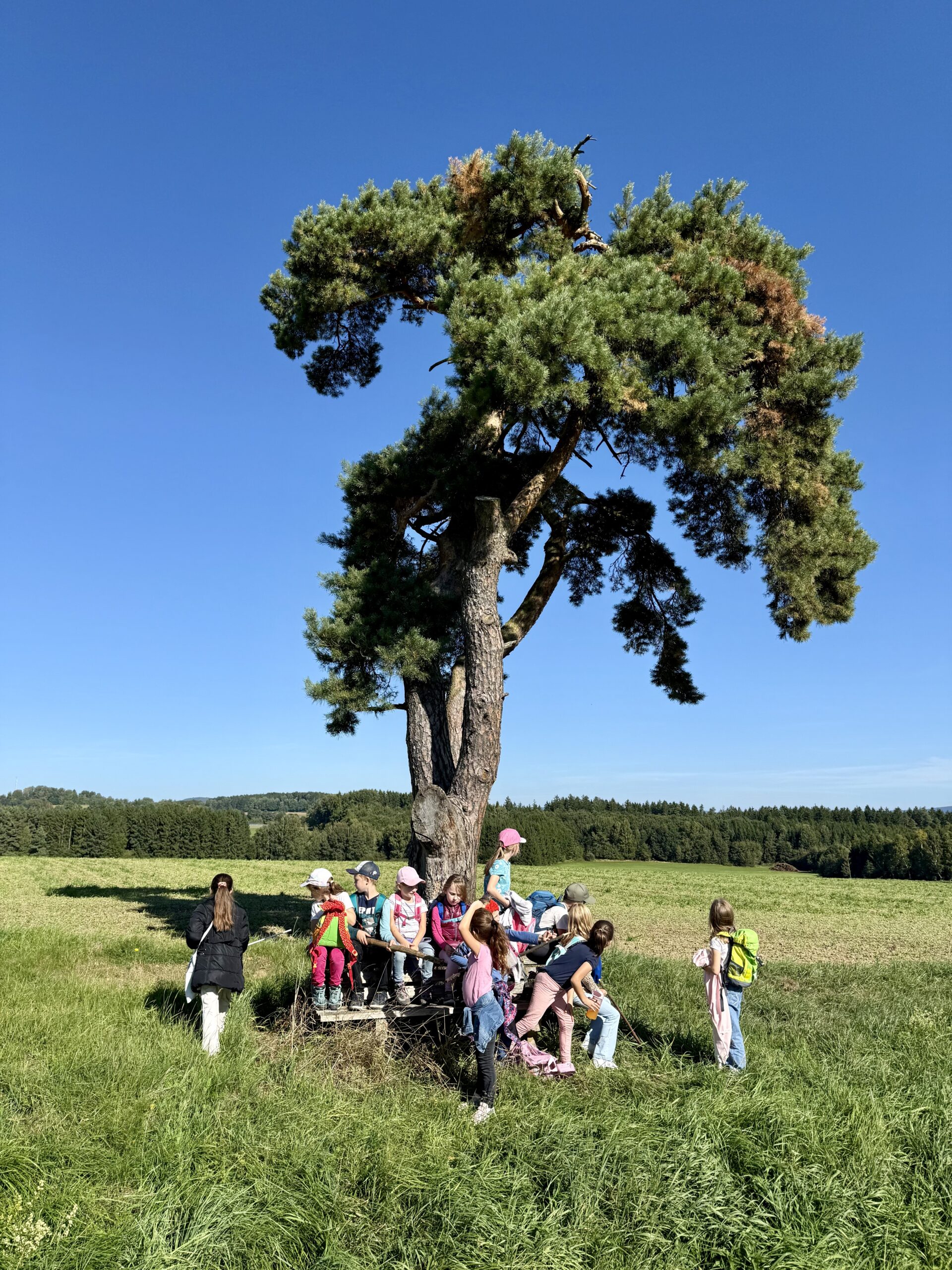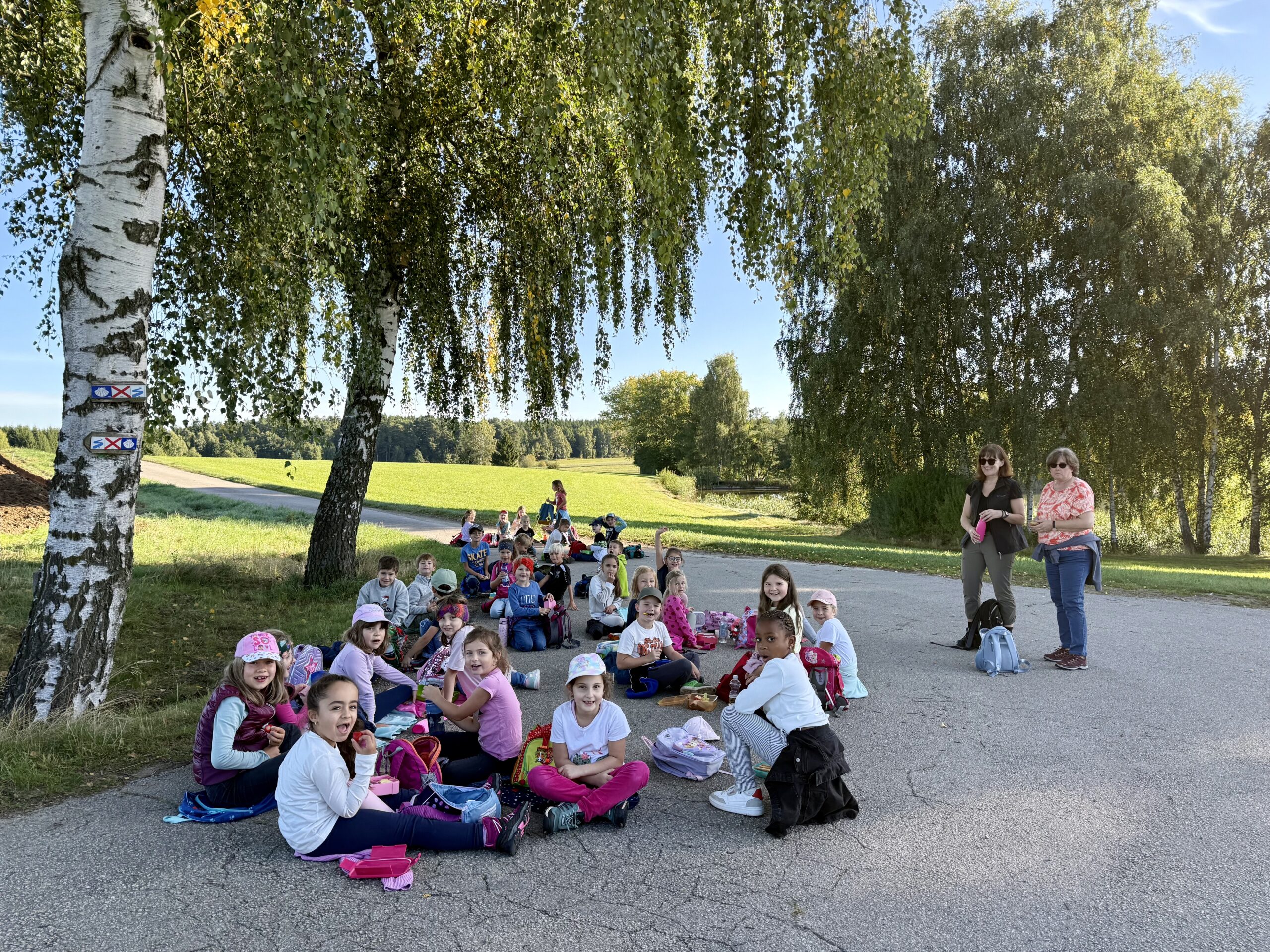 Unsere Route führte uns bei strahlendem Sonnenschein und blauem Himmel in Richtung Matthesenweiher. Von dort ging es in einer großen, schönen Runde, unterbrochen von mehreren kleinen Brotzeitpausen, wieder zurück zur Schule. Insgesamt waren wir über sechs Kilometer unterwegs – eine richtige Leistung für alle kleinen Wanderer!