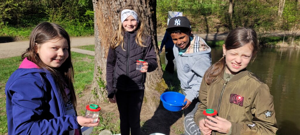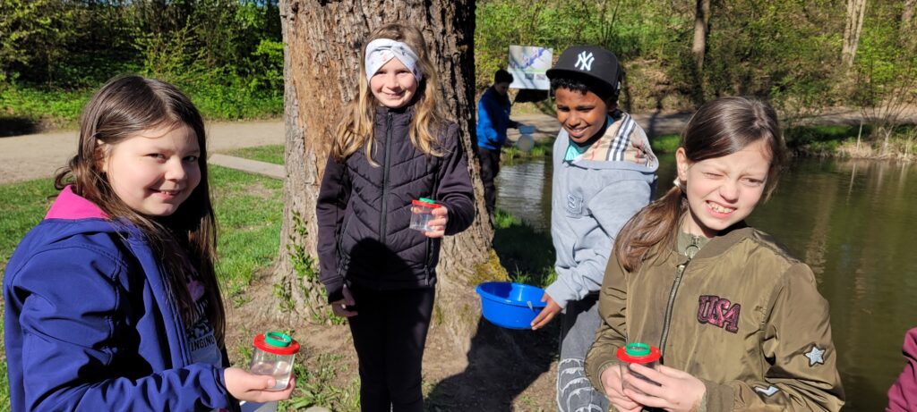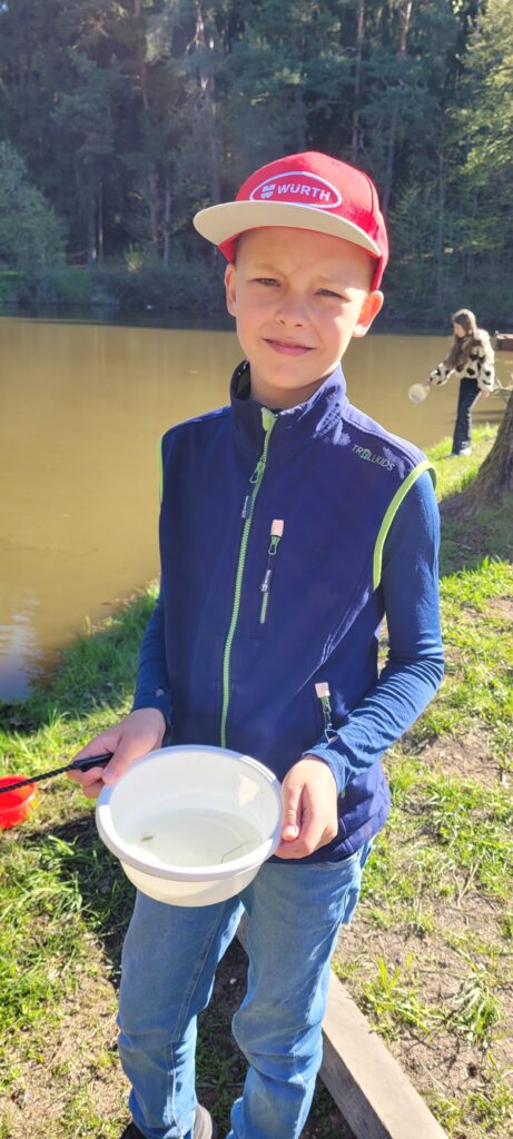 Vor Ort waren verschiedene Anbieter mit spannenden Mitmach-Stationen vertreten. Unsere Klasse war zuerst dem LBV zugeteilt. Am Weiherufer gingen die Schülerinnen und Schüler auf Entdeckungstour und untersuchten kleine Wassertiere. Mit Becherlupen konnten sie die faszinierenden Lebewesen aus nächster Nähe betrachten und viel über deren Lebensraum erfahren.